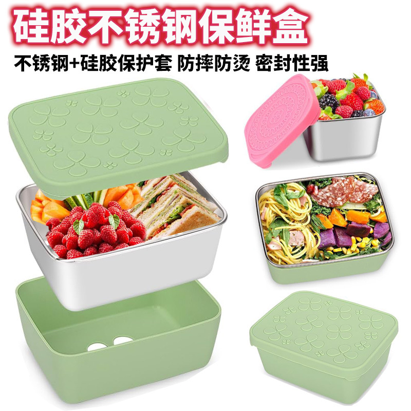 Silicone lid lunch box, sealed anti-overflow preservation box, storage box, stainless steel square lunch box, children's snack lunch box