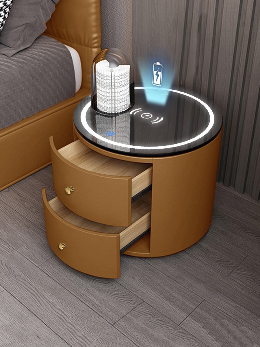 Smart bedside table, circular creative wireless charging, multi-functional audio system, fingerprint lock, lock light, rock plate glass bedside cabinet