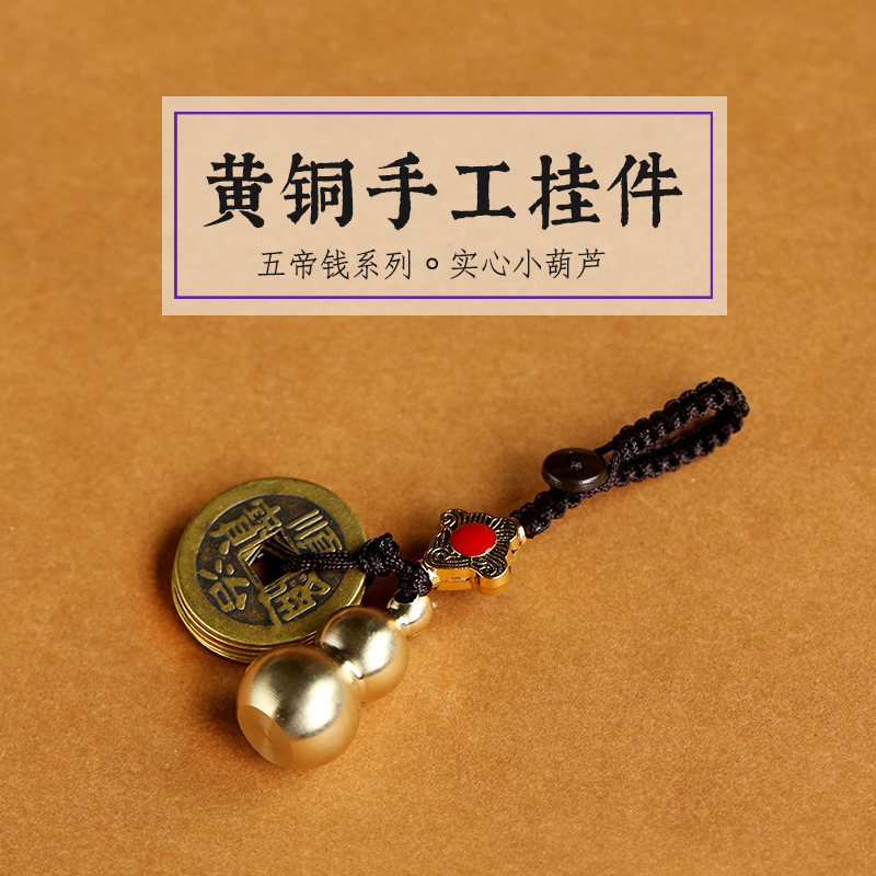 Solid brass small gourd pendant, auspicious and lucky for men and women, car bag hanging, peace, pure copper Five Emperors coin keychain
