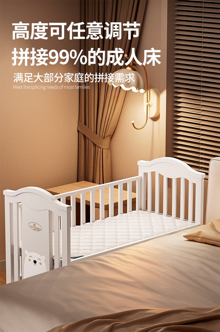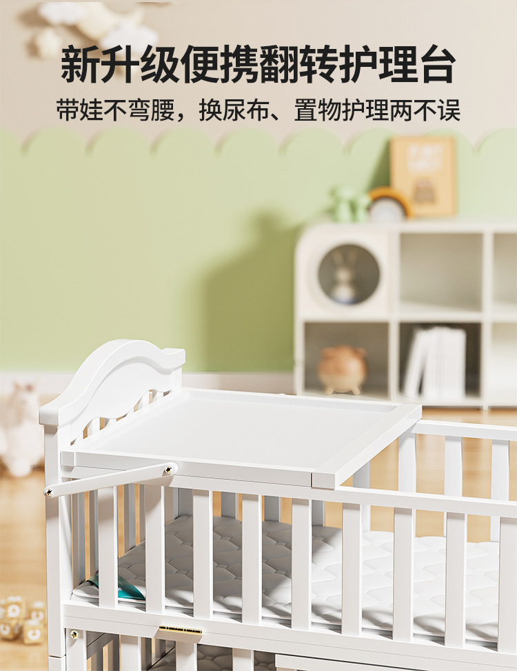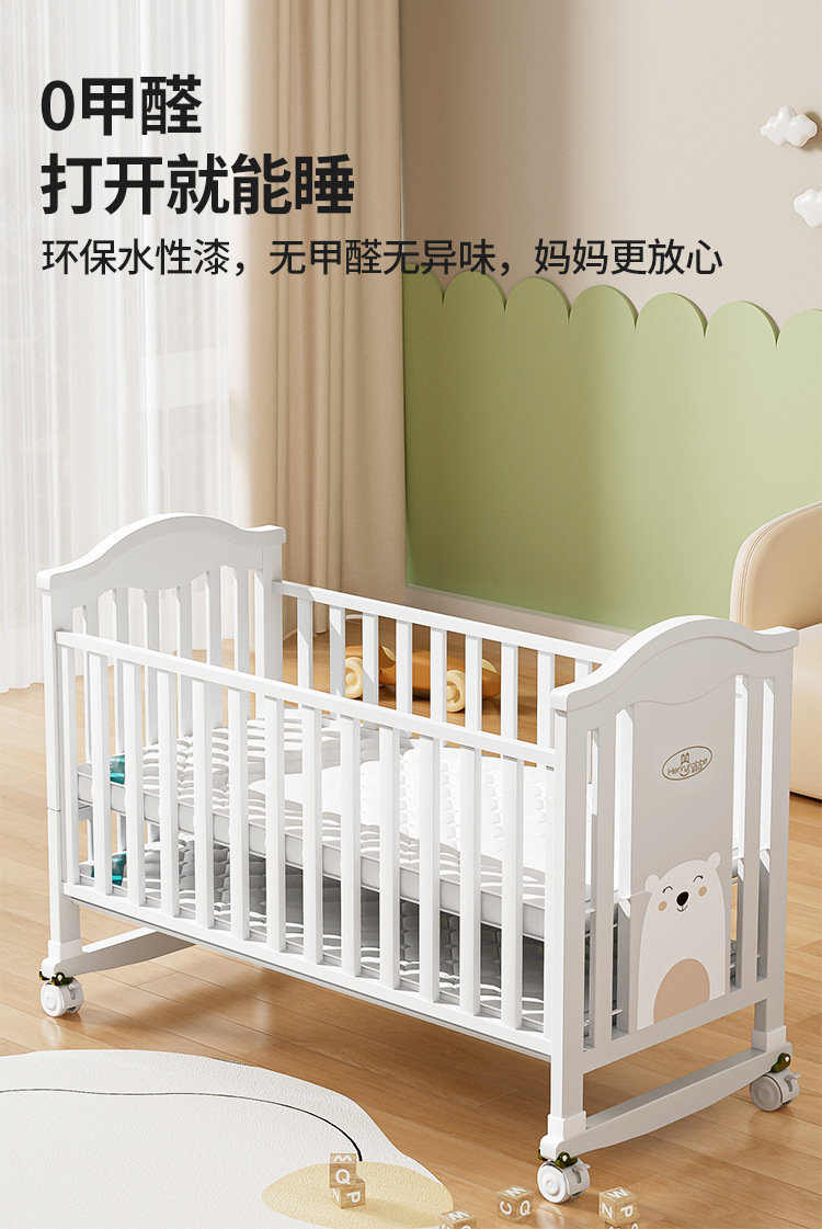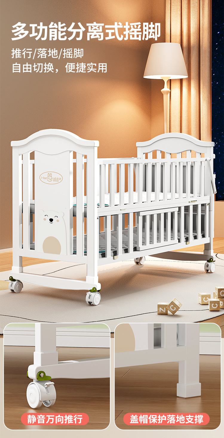Solid wood European-style movable baby bed, multi-functional cradle for newborns, children's spliced large bed