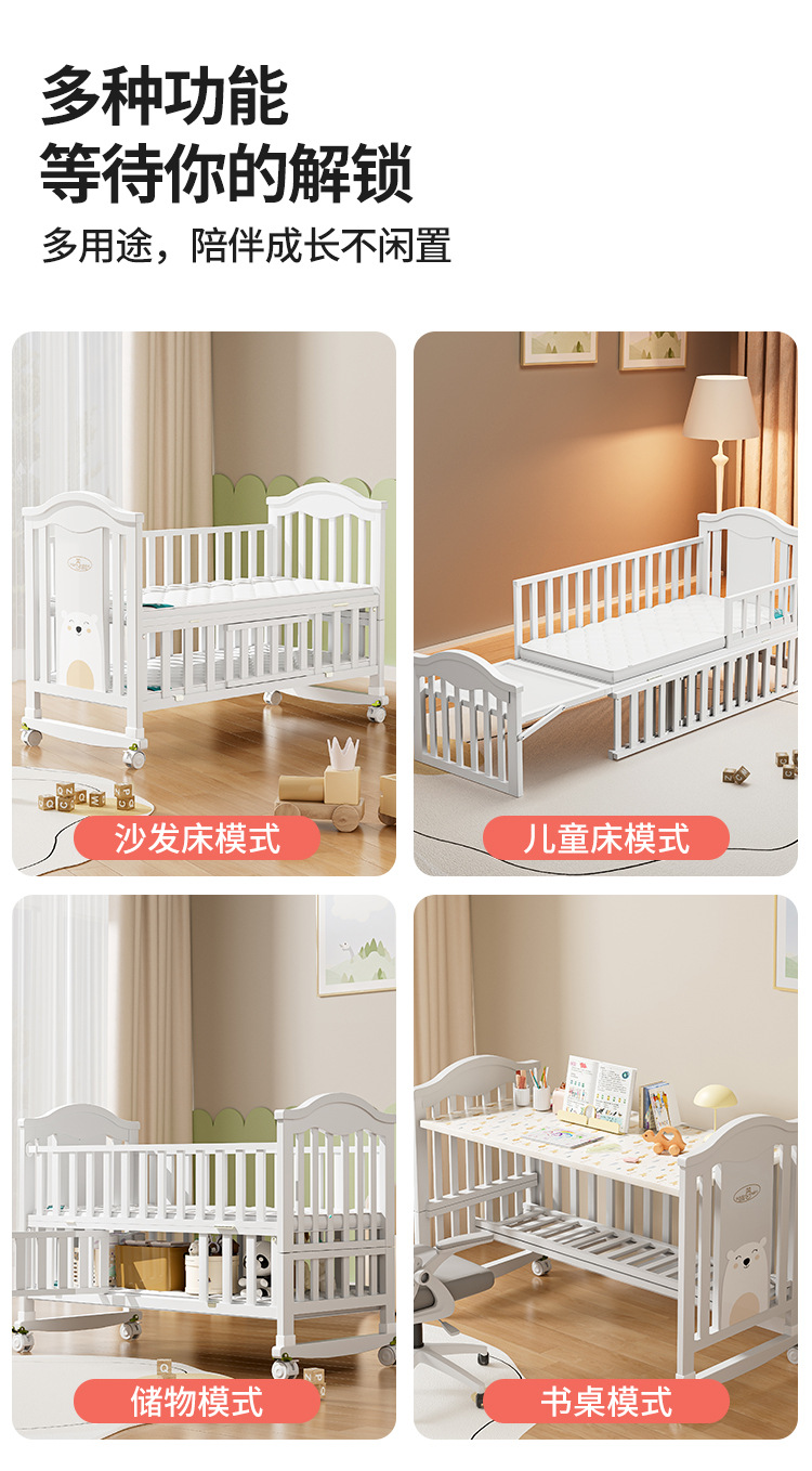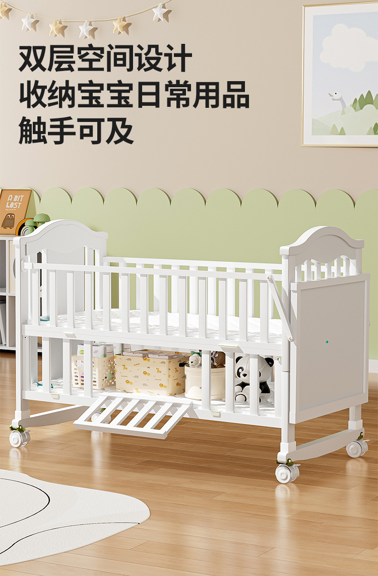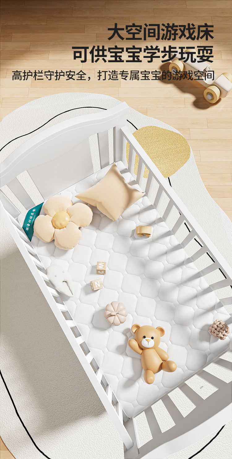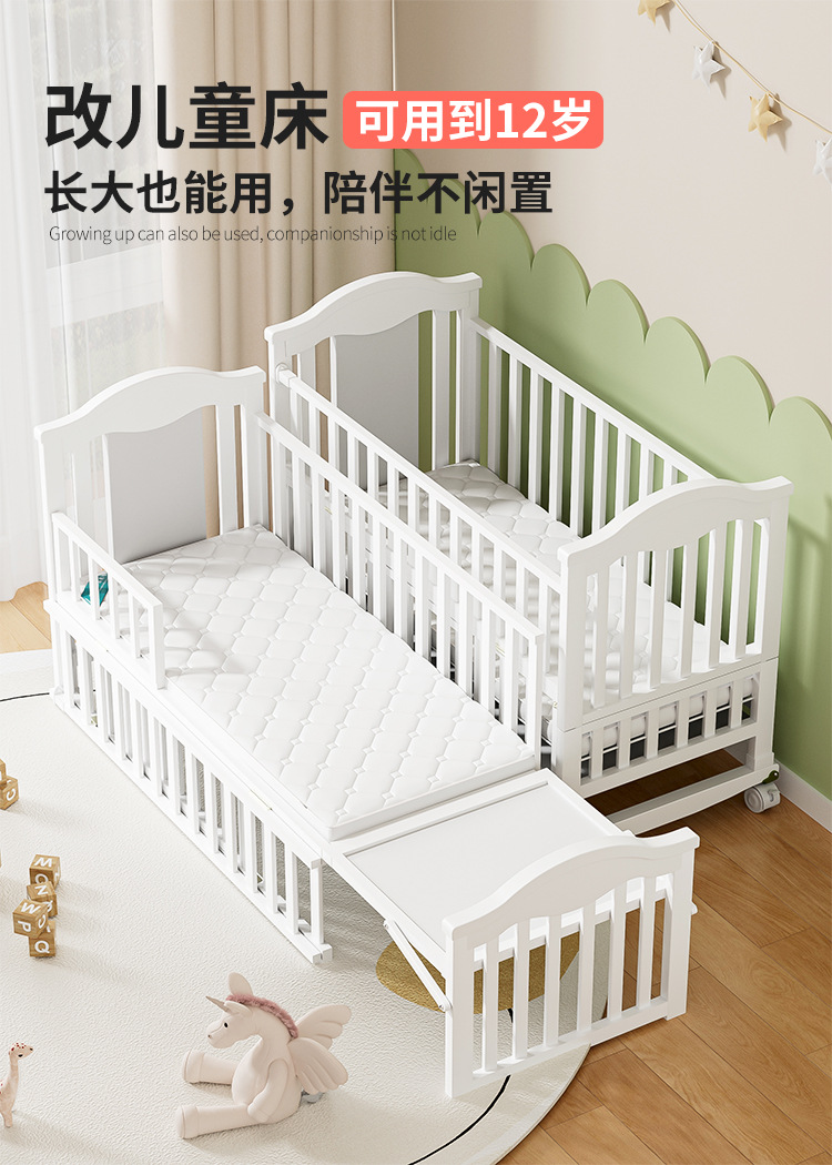 Solid wood European-style movable baby bed, multi-functional cradle for newborns, children's spliced large bed