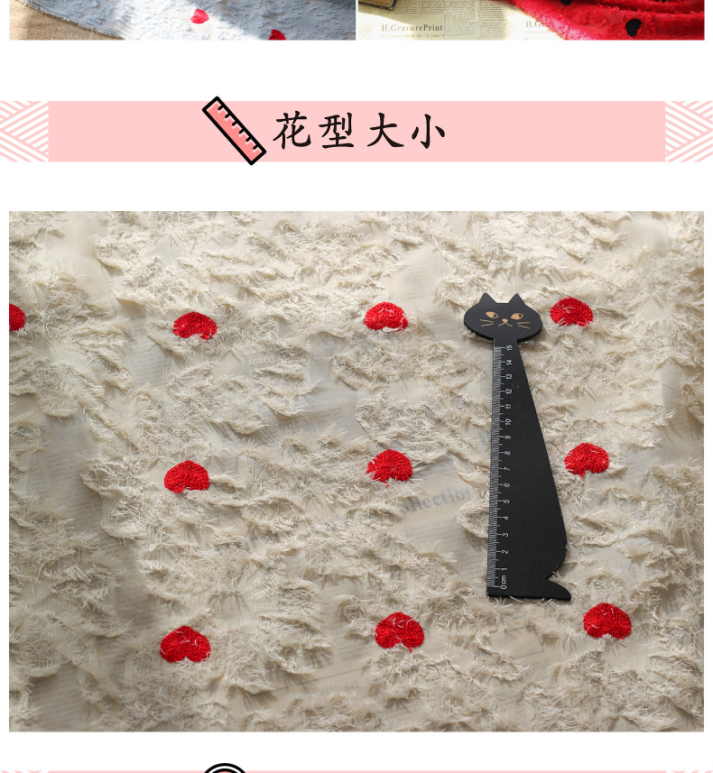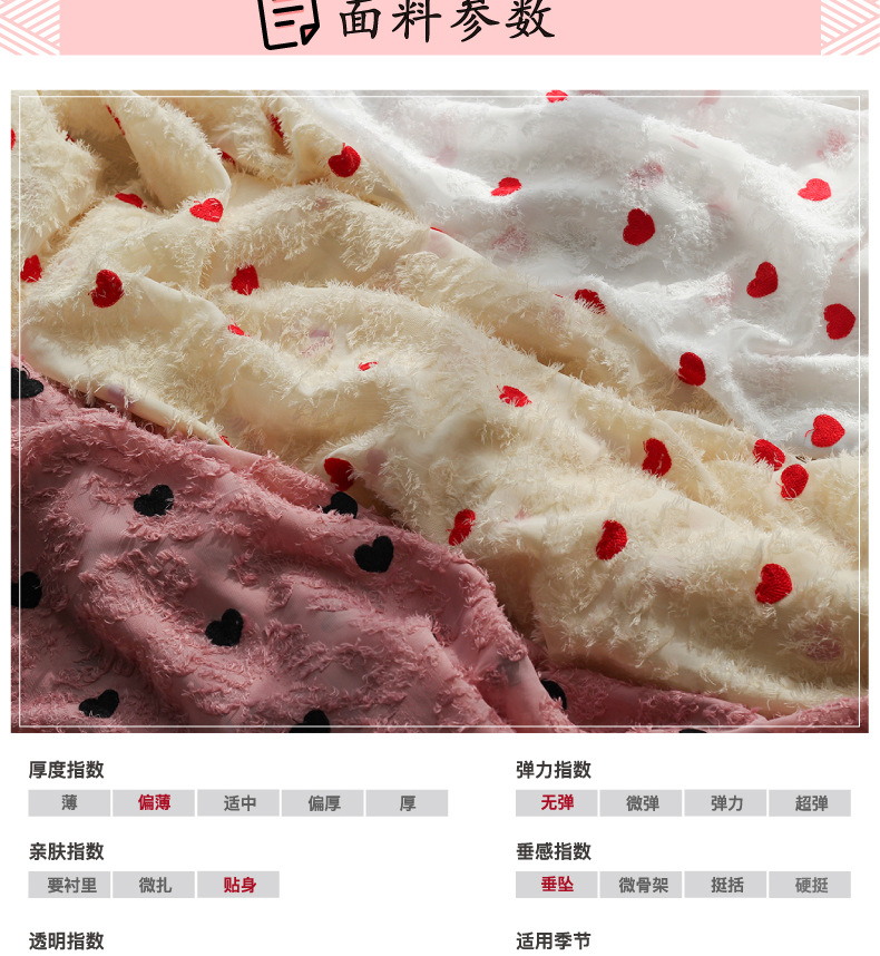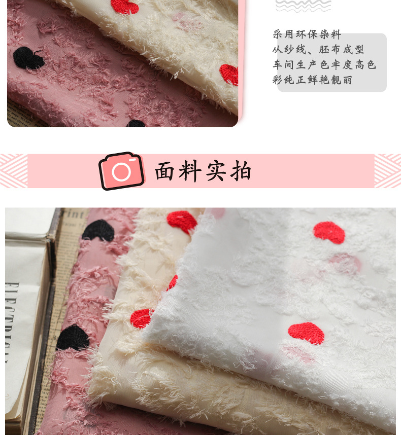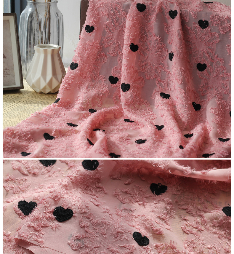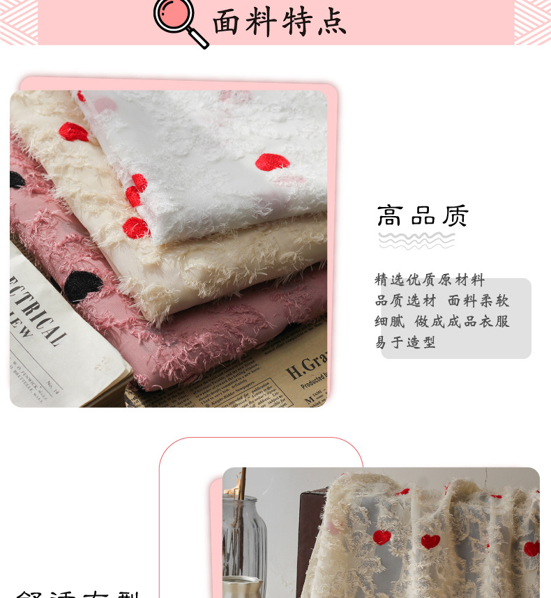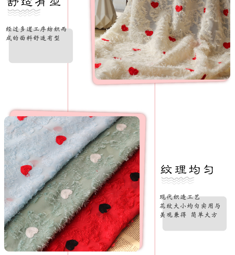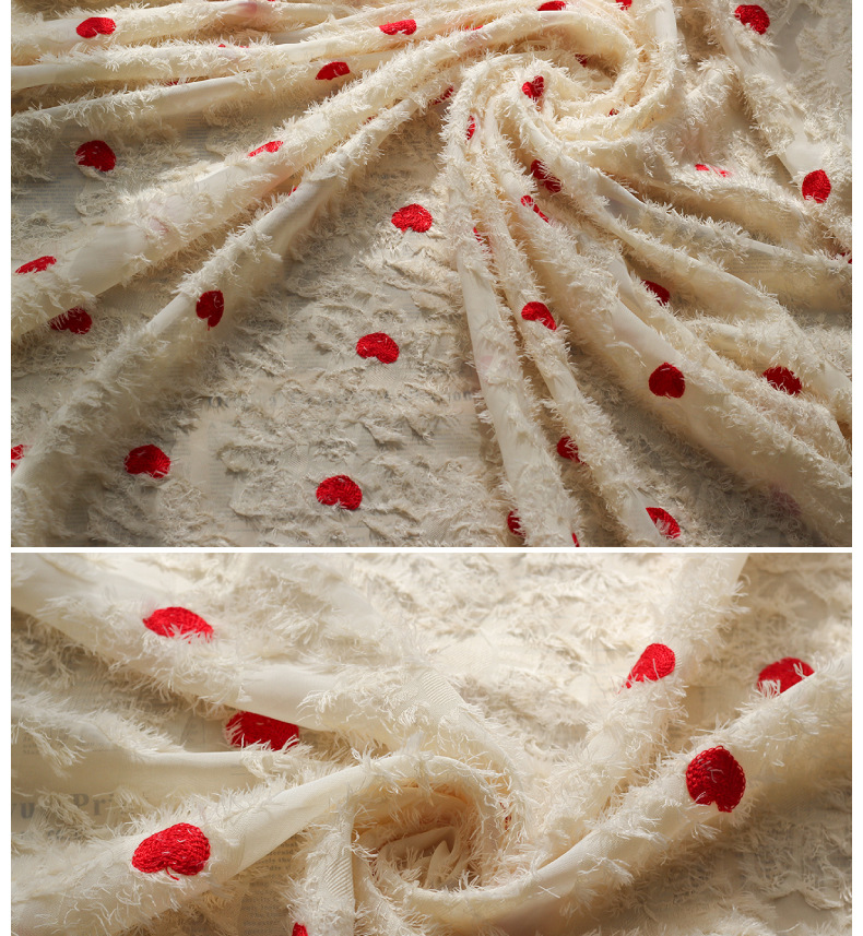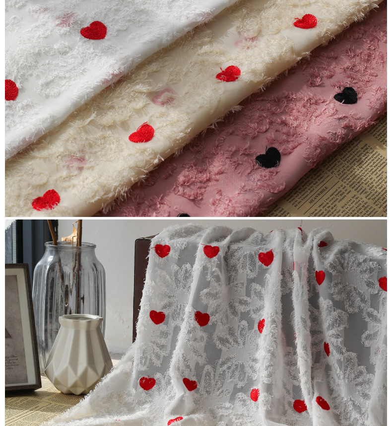 Spring and summer new chiffon cut-wool tassel fabric, heart-shaped embroidered multi-color available fabric, Japanese and Korean women's dress fabric