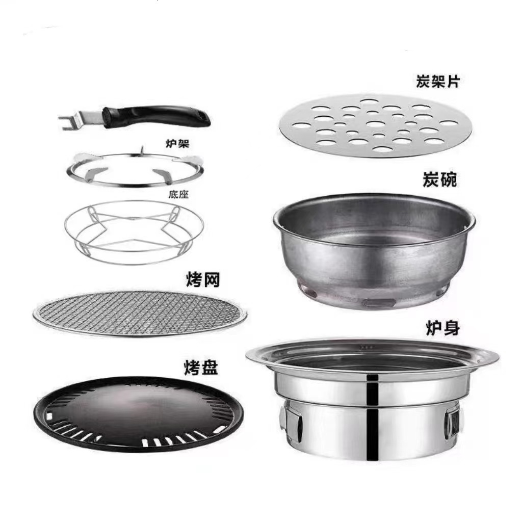 Stainless steel Korean-style barbecue grill, charcoal grill, small household and commercial round outdoor camping charcoal grill, barbecue plate