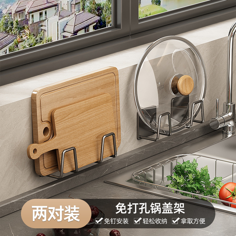 Stainless steel pot lid rack, kitchen multi-functional storage rack, non-drilling wall-mounted cutting board rack, wall storage