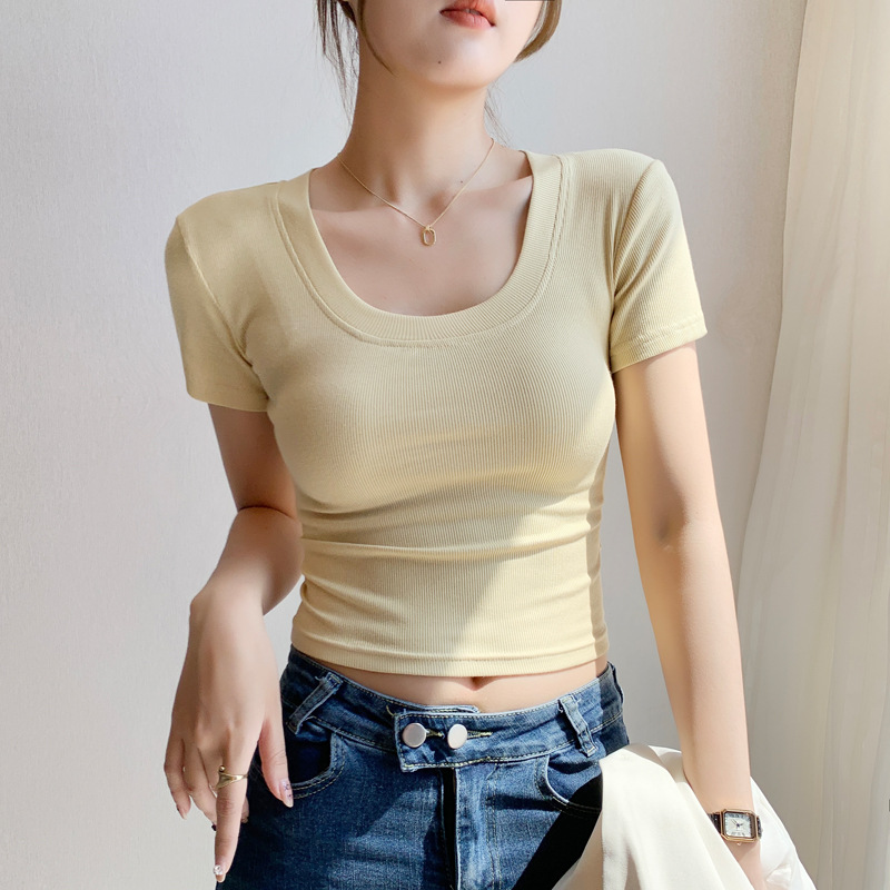 Straight-shoulder short-sleeved T-shirt for women, short style 2025 summer, slimming and flattering, revealing collarbone, pure cotton T-shirt with threaded inner layer