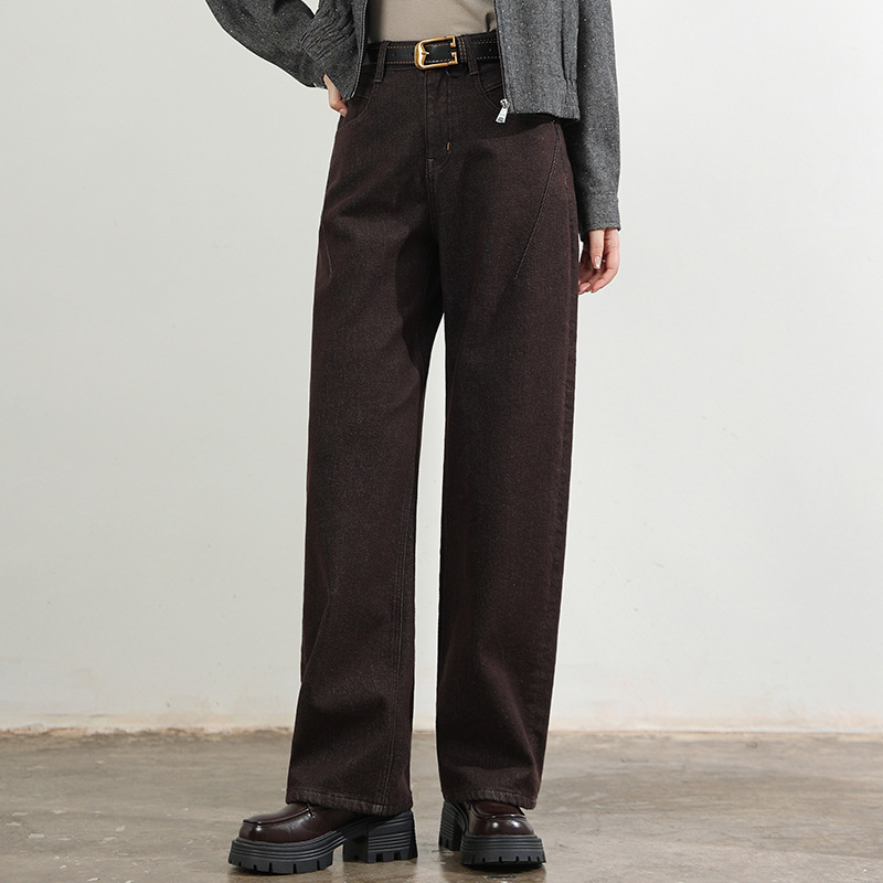 Sudo's new winter fleece jeans are a fashionable women's style. They are in a loose coffee color with a side that saves space and makes you look slimmer. They are a versatile scythe pants