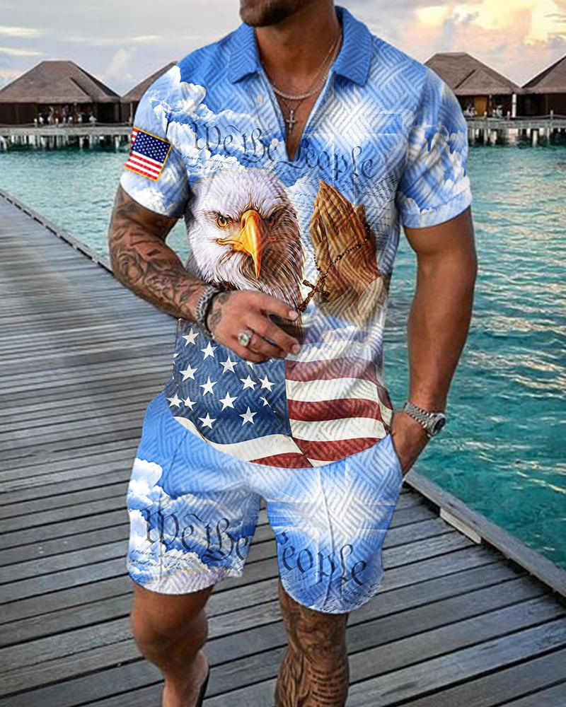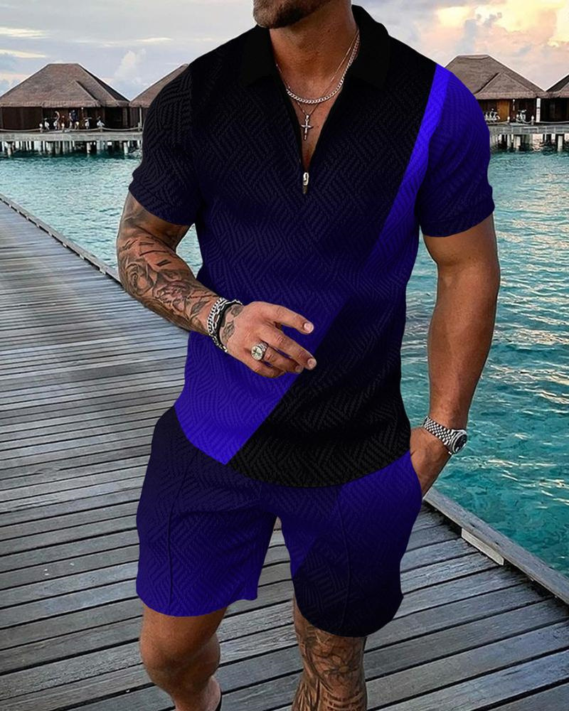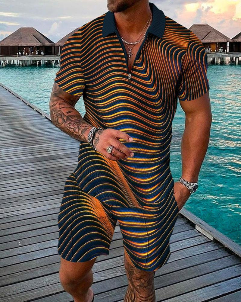 Summer cross-border fashion lapel and zipper polo shirt and shorts set, large-sized men's casual 3D printed sportswear set