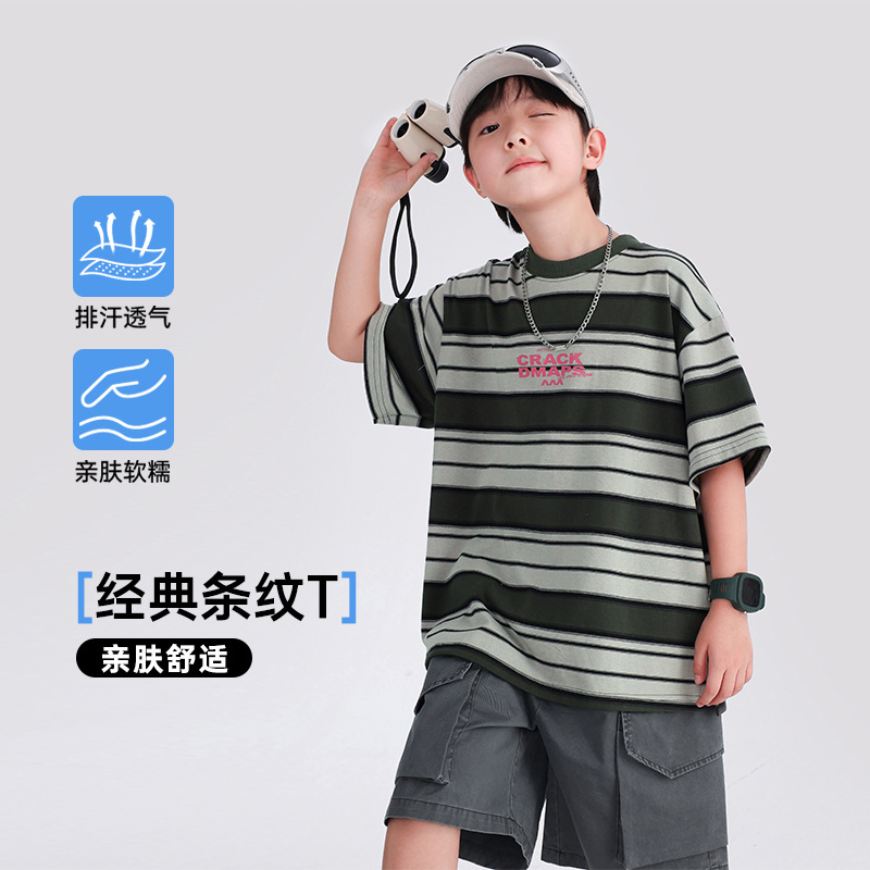 Summer Korean striped short-sleeved T-shirt for boys, 2025 new style children's wear, loose and cool summer top for boys