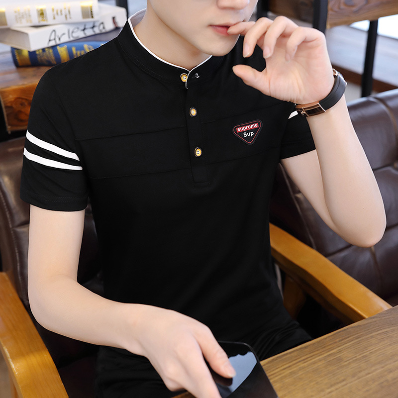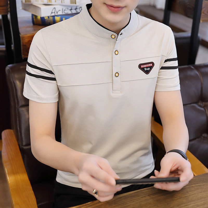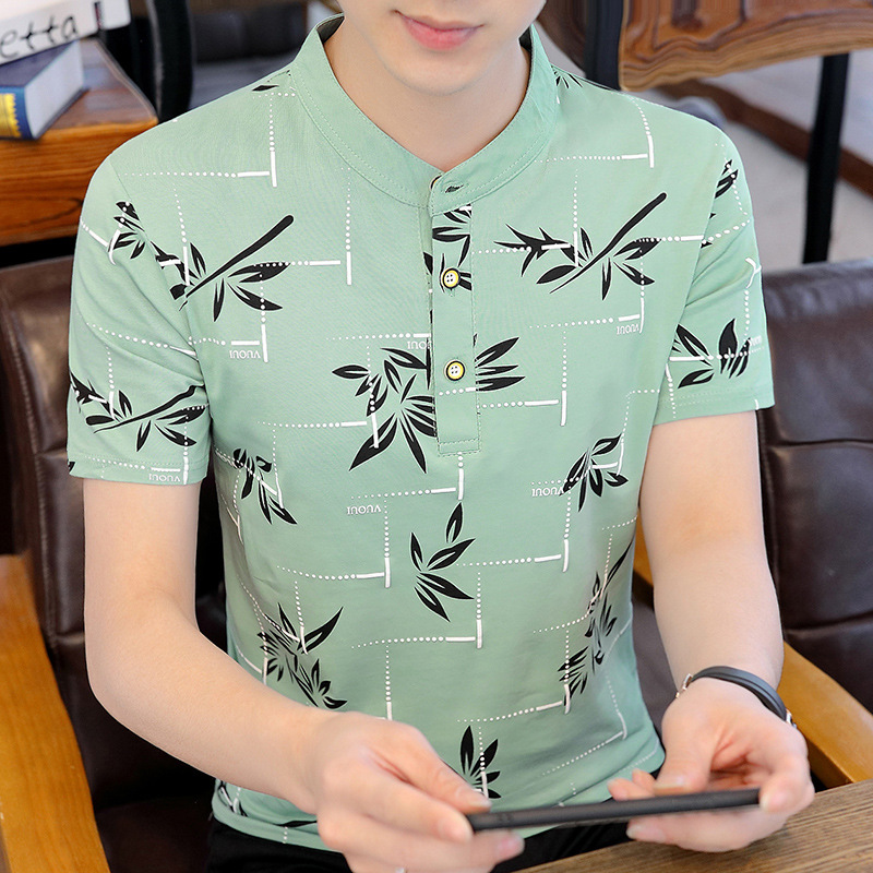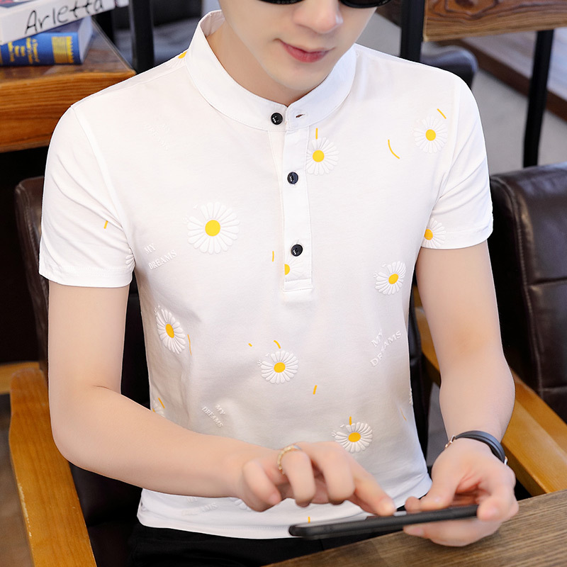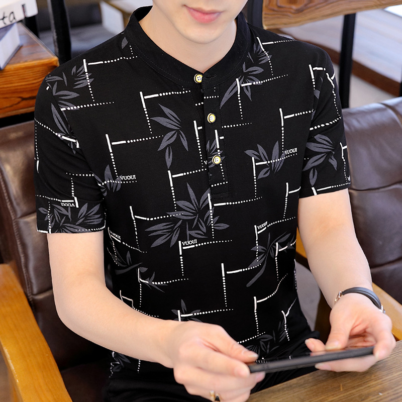 Summer men's stand-up collar, fashionable and personalized printed short-sleeved T-shirt, trendy Korean-style slimming men's pullover top for teenagers