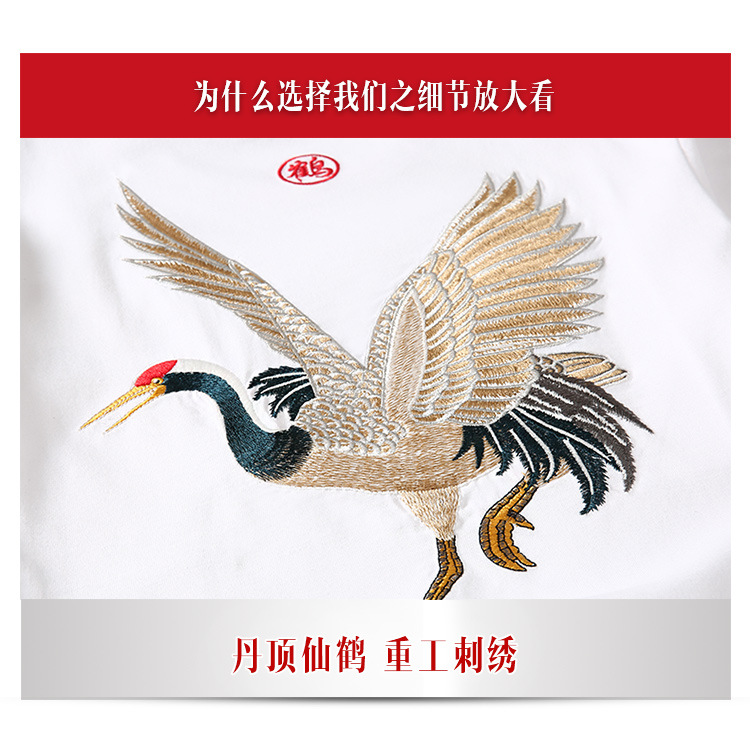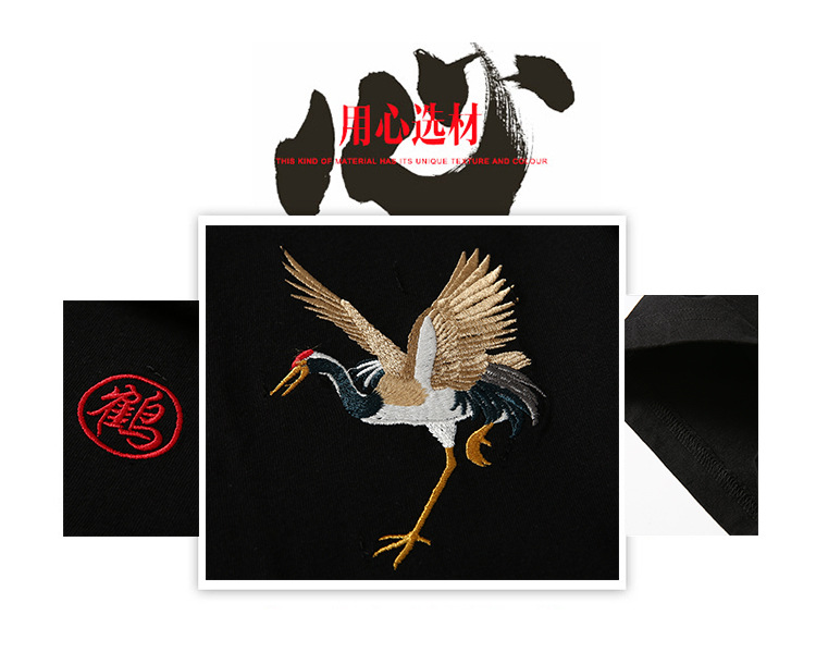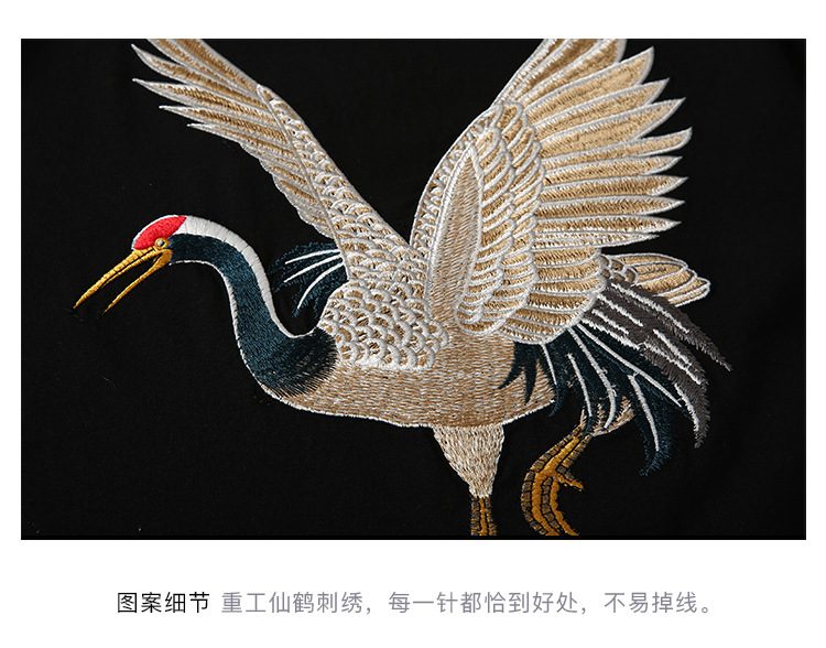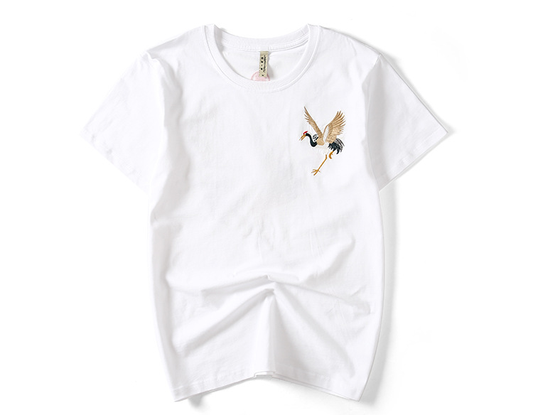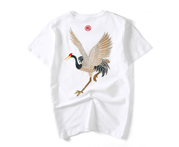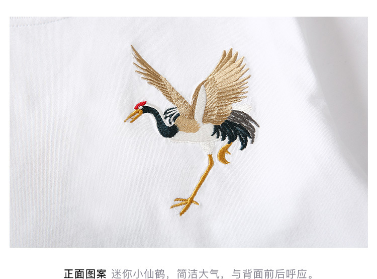 Summer new Chinese trend brand retro ethnic style pure cotton embroidered crane men's short-sleeved T-shirt, loose for men