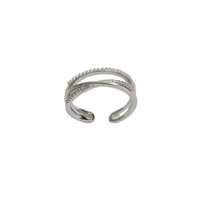 Summer new minimalist design, pearl and diamond double-layer cross ring, personalized, light luxury, versatile open ring wholesale