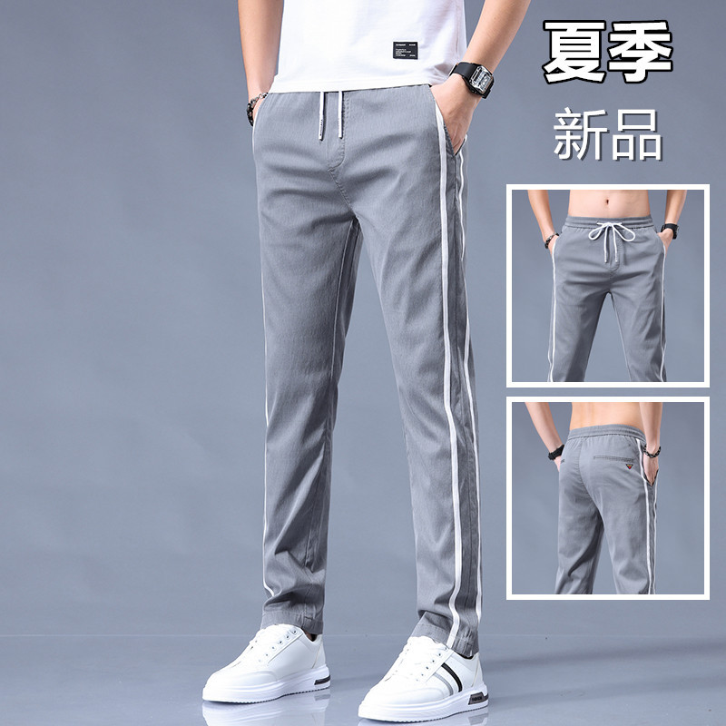 Summer elastic slimming straight leg height-enhancing casual pants for men, thin vertical striped drawstring Lysel trousers for men