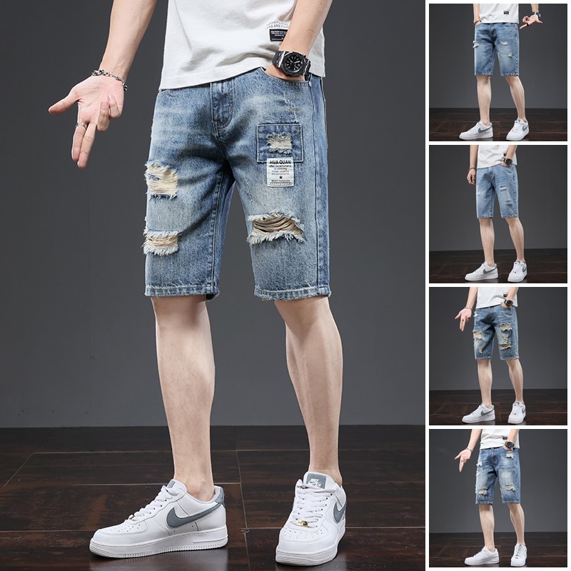 Ripped denim shorts for men's summer trend Loose straight-leg casual men's mid-length pants 2023 new style five-inch pants trend