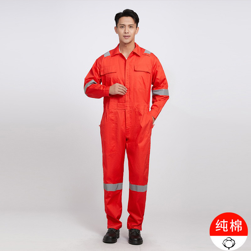 Summer pure cotton one-piece work clothes for men, long-sleeved thin all-cotton one-piece suit set, reflective strip Marine vessel staff uniform