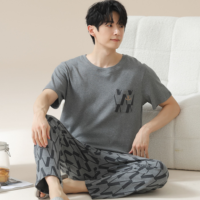 Summer pure cotton pajamas for men, cartoon casual short-sleeved shirts and long pants, pure cotton comfortable home wear, summer youth student set