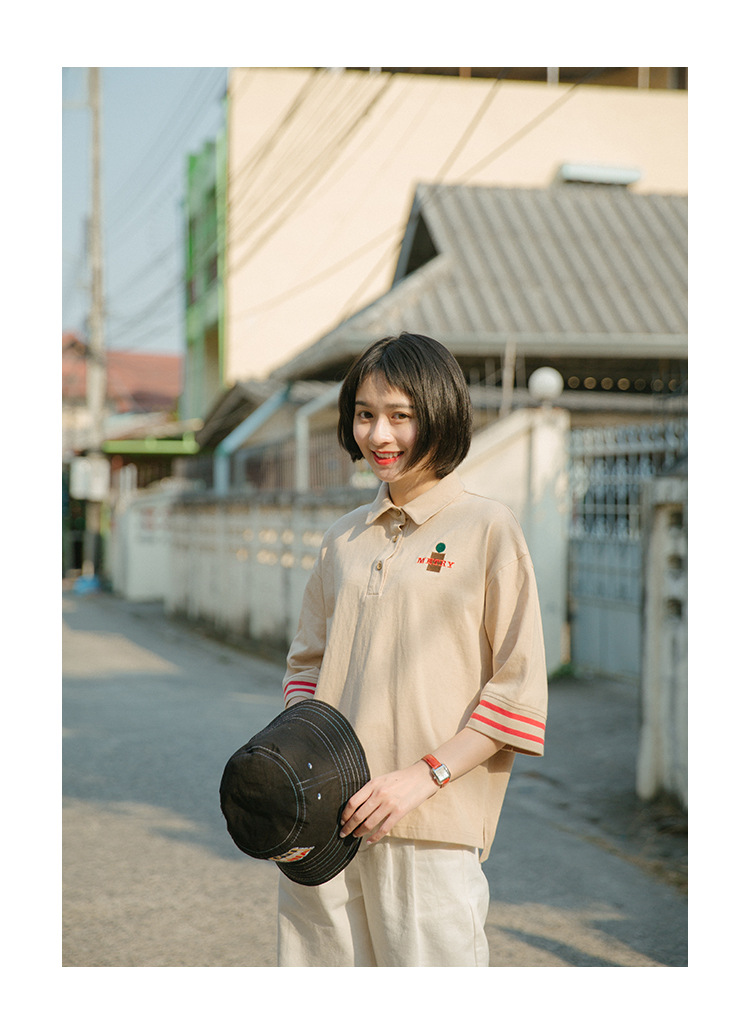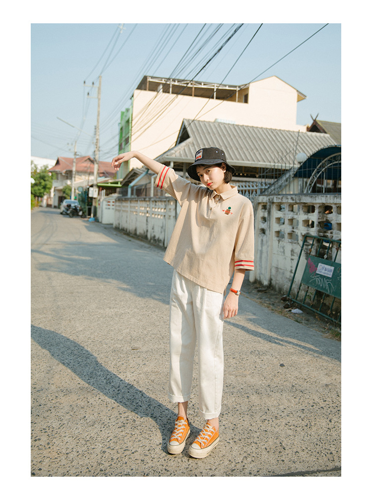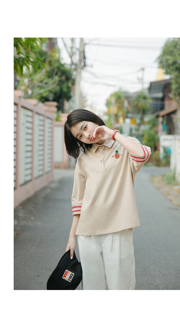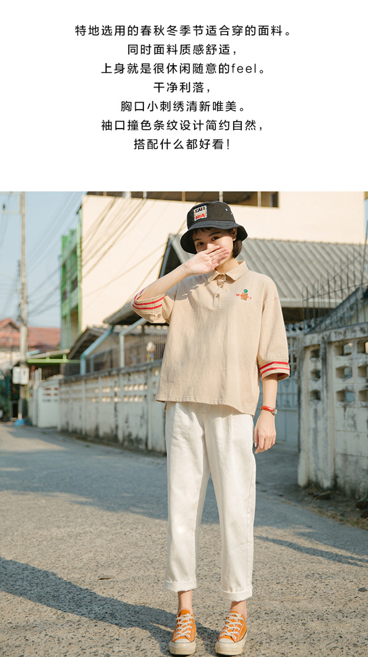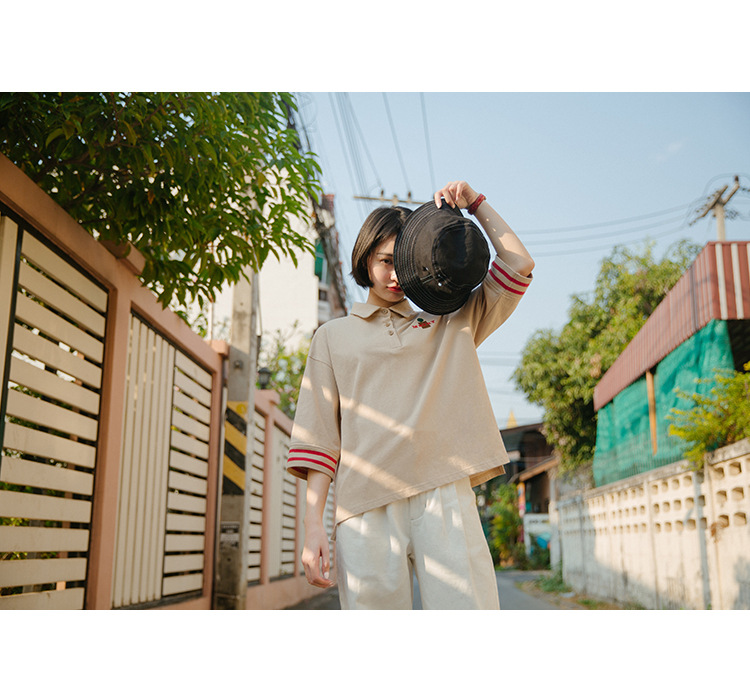 Summer's new retro POLO collar five-sleeved light and fresh T-shirt for female students, loose embroidered color-blocking mid-sleeved top