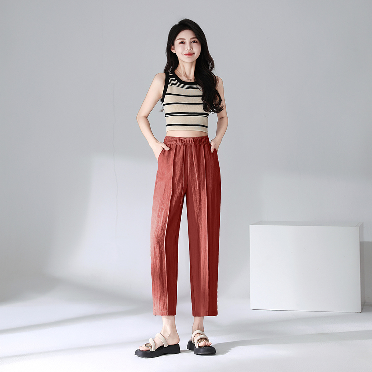 Summer thin Tencel linen nine-inch pants for women, elastic high-waisted tapered pants, 2025 new style Halon pants, cigarette tube pants for women