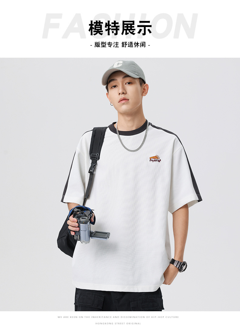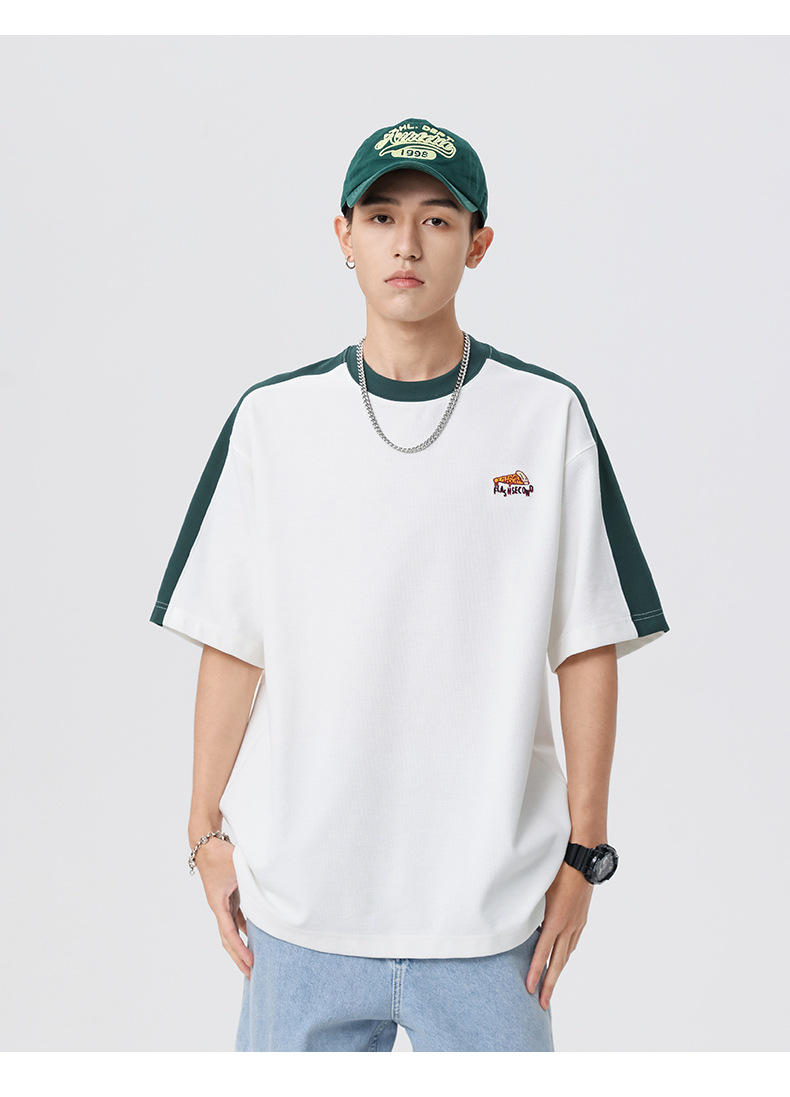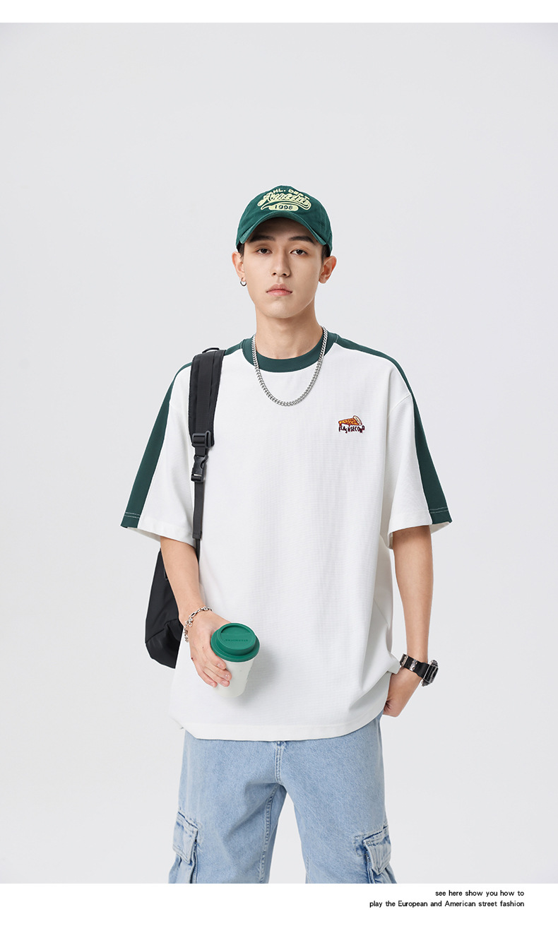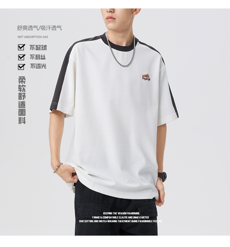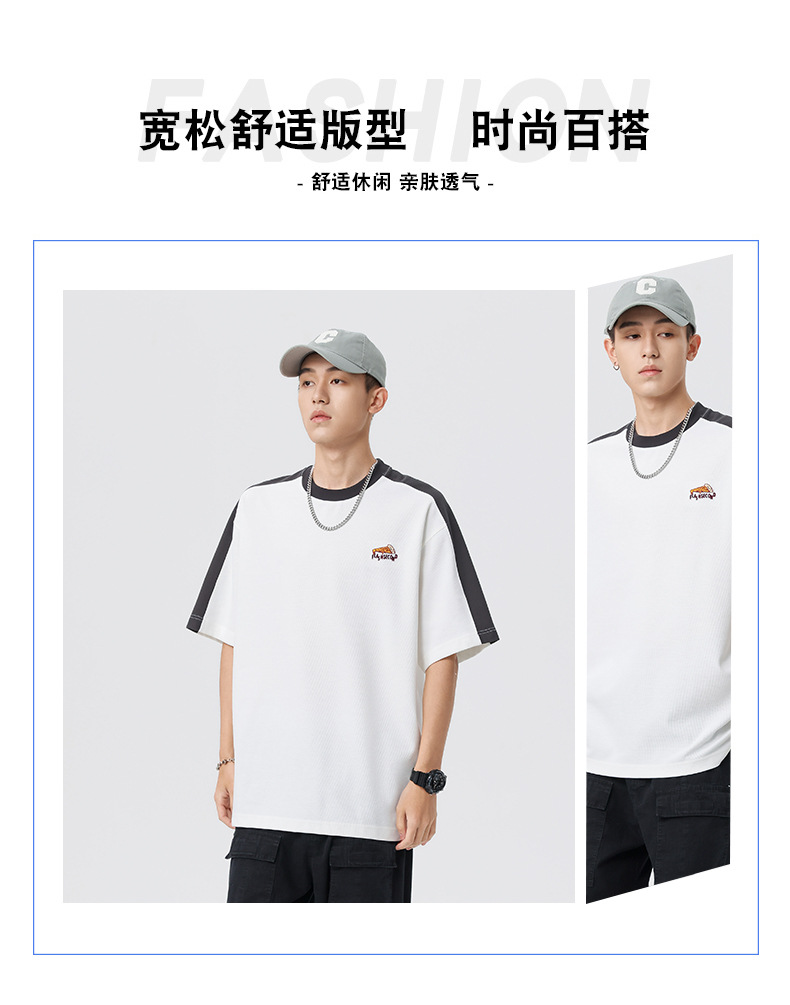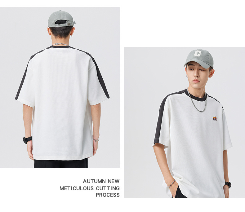 Summer Waffle short-sleeved men's loose pullover with a round neck and color contrast patchwork heavyweight half-sleeved T-shirt