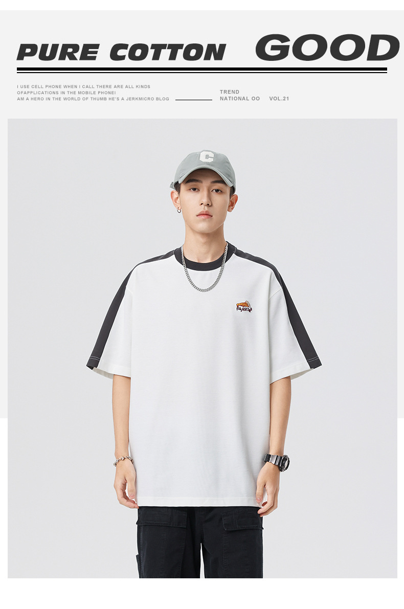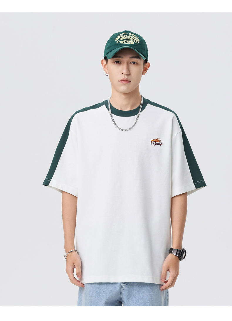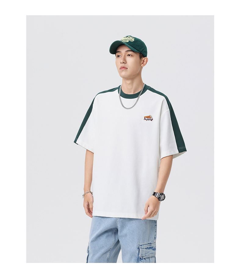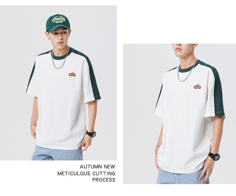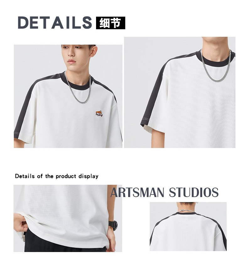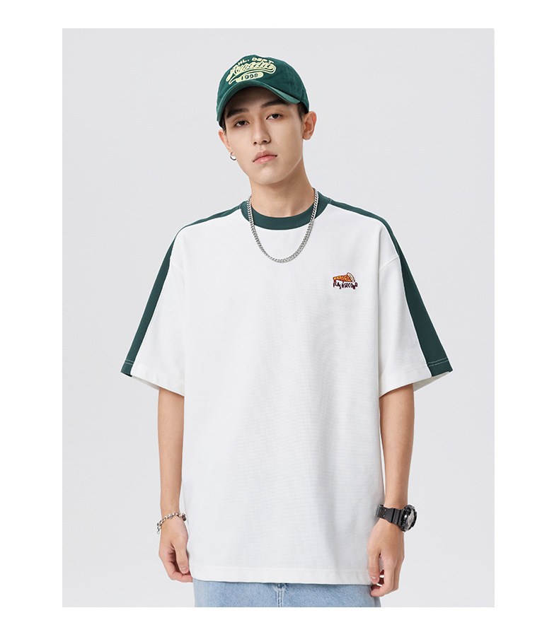 Summer Waffle short-sleeved men's loose pullover with a round neck and color contrast patchwork heavyweight half-sleeved T-shirt