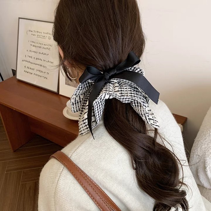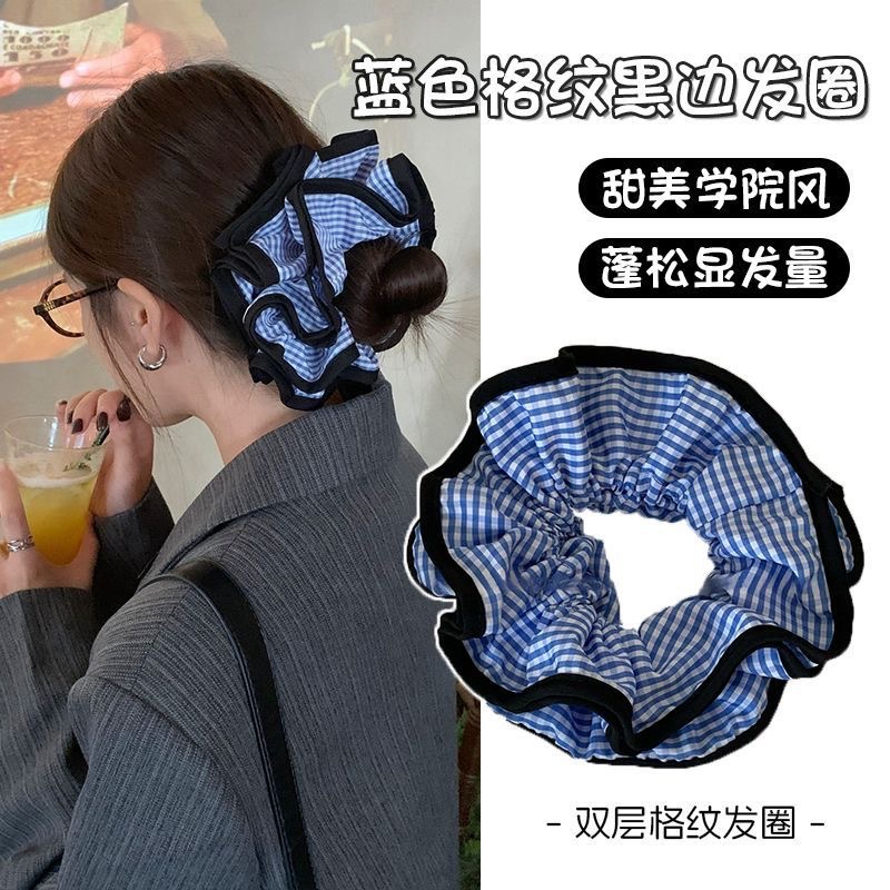 77# Blue checkered double-layer large intestine hair band, about 15cm