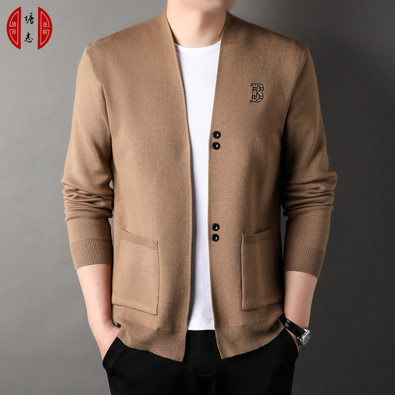Men's autumn new knitted sweater coat, Korean style trendy embroidered high-elastic long-sleeved cardigan for men