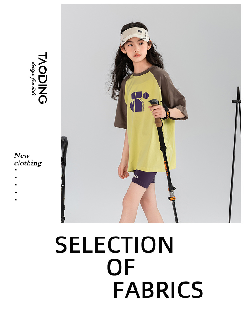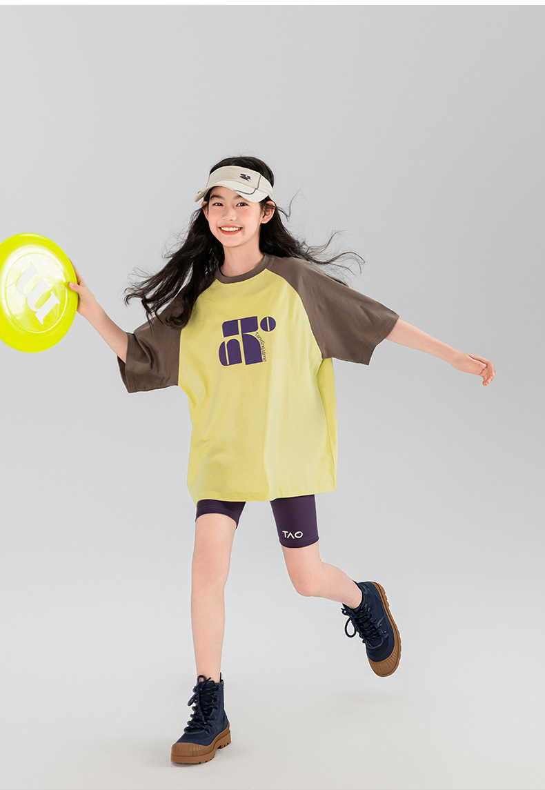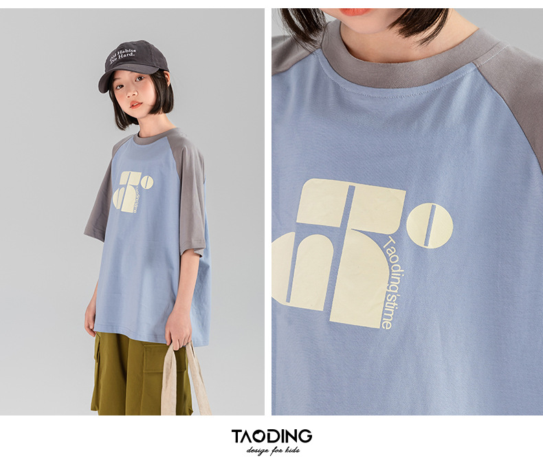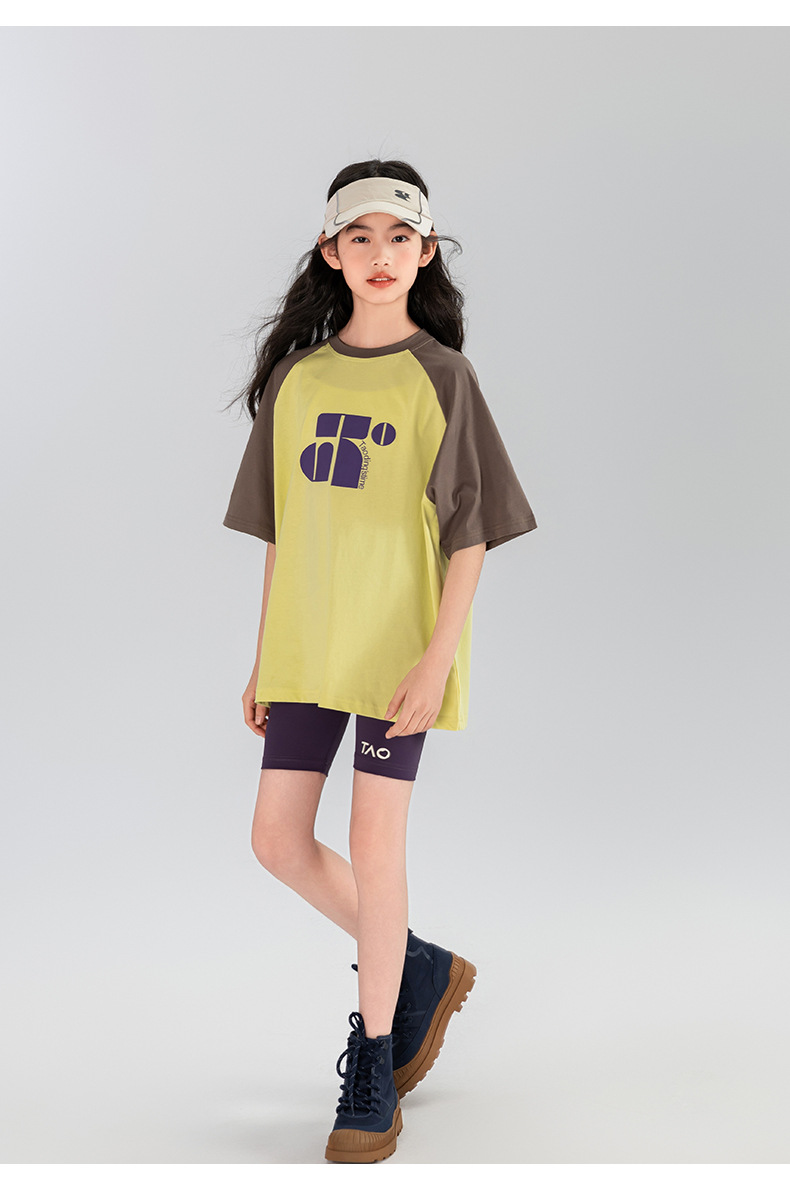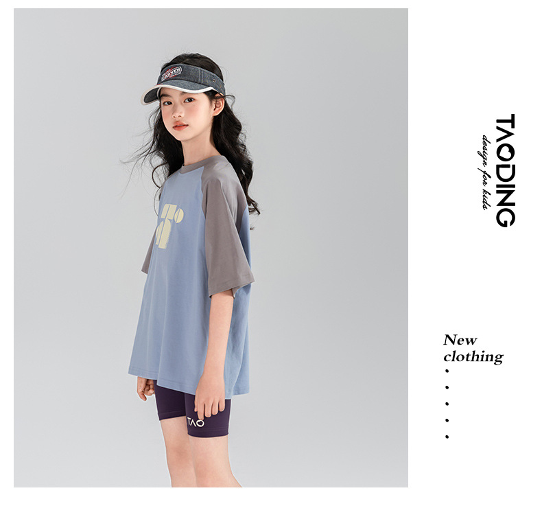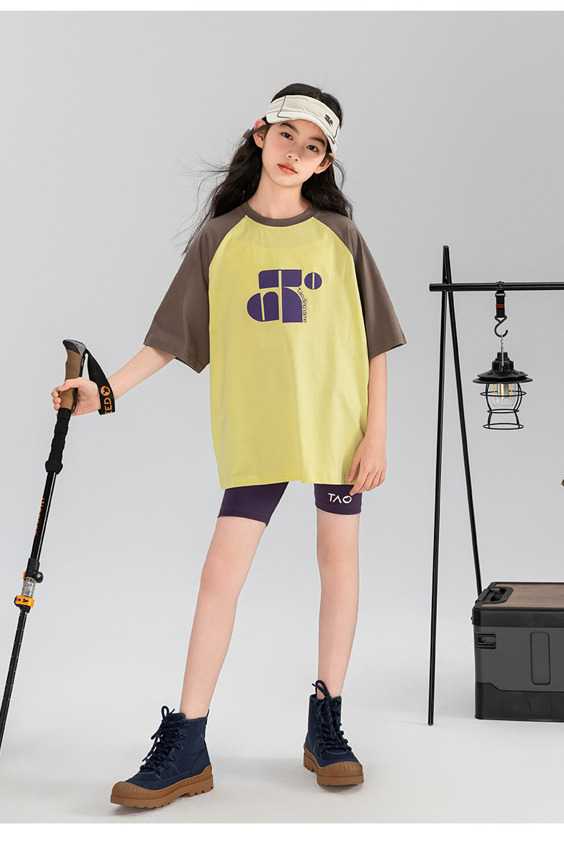 Taotong Girls' T-shirt Summer 2024: American mountain sporty print pure cotton short-sleeved, color-blocking shoulder sleeve