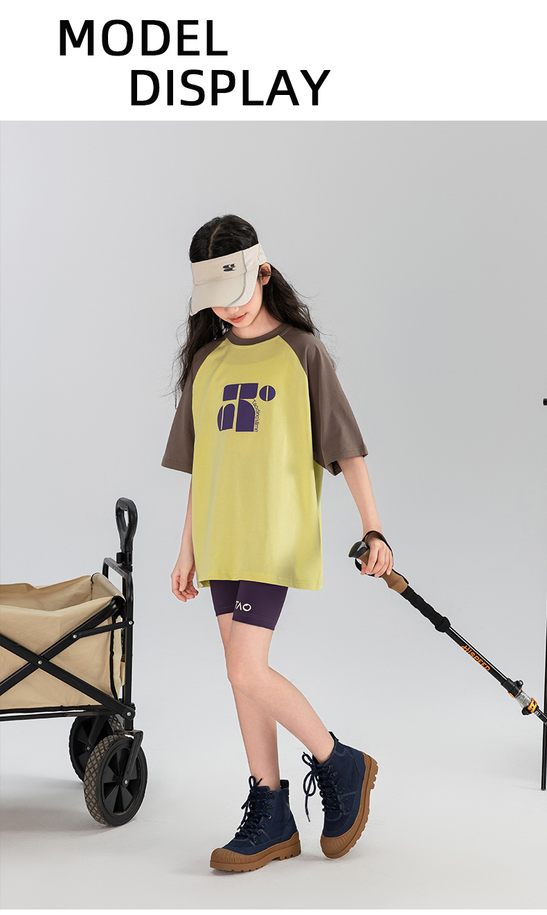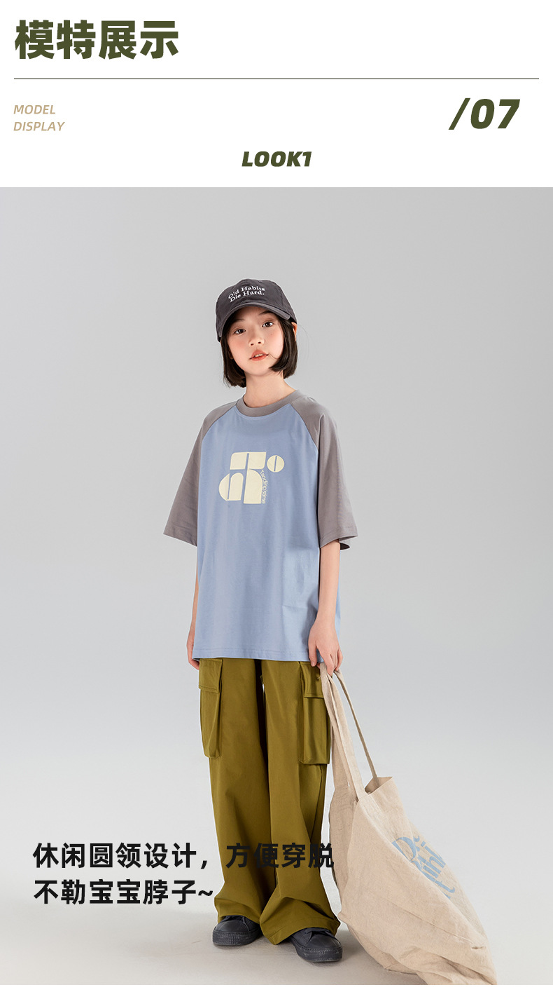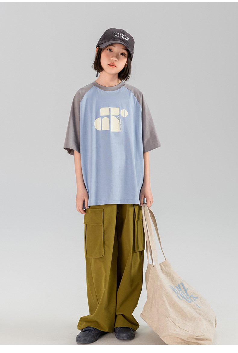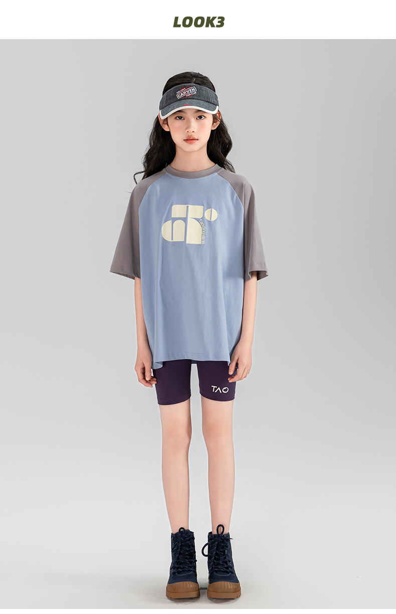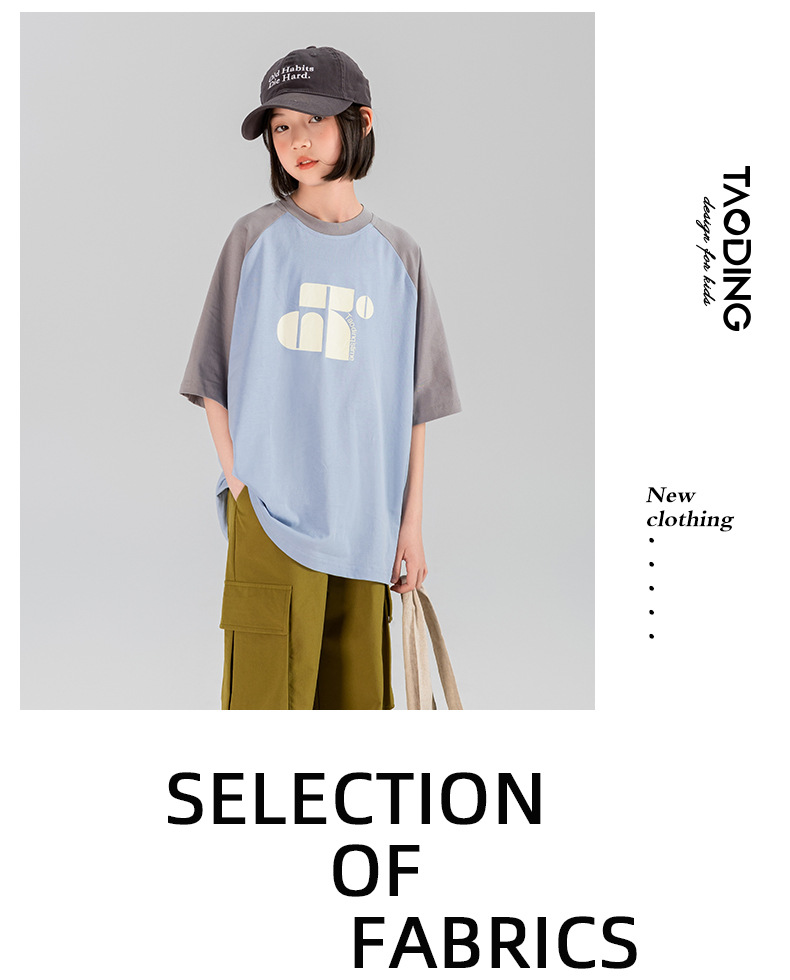 Taotong Girls' T-shirt Summer 2024: American mountain sporty print pure cotton short-sleeved, color-blocking shoulder sleeve