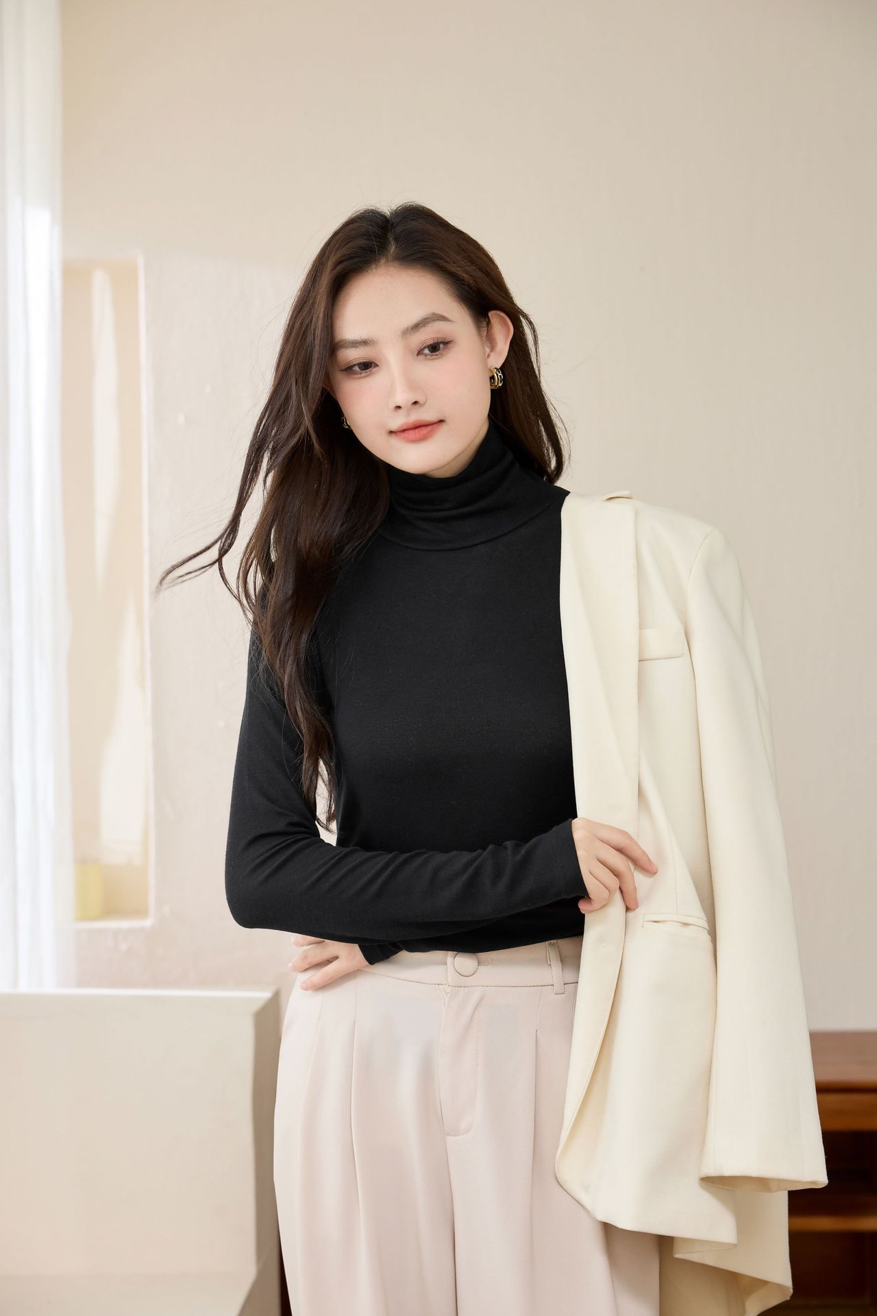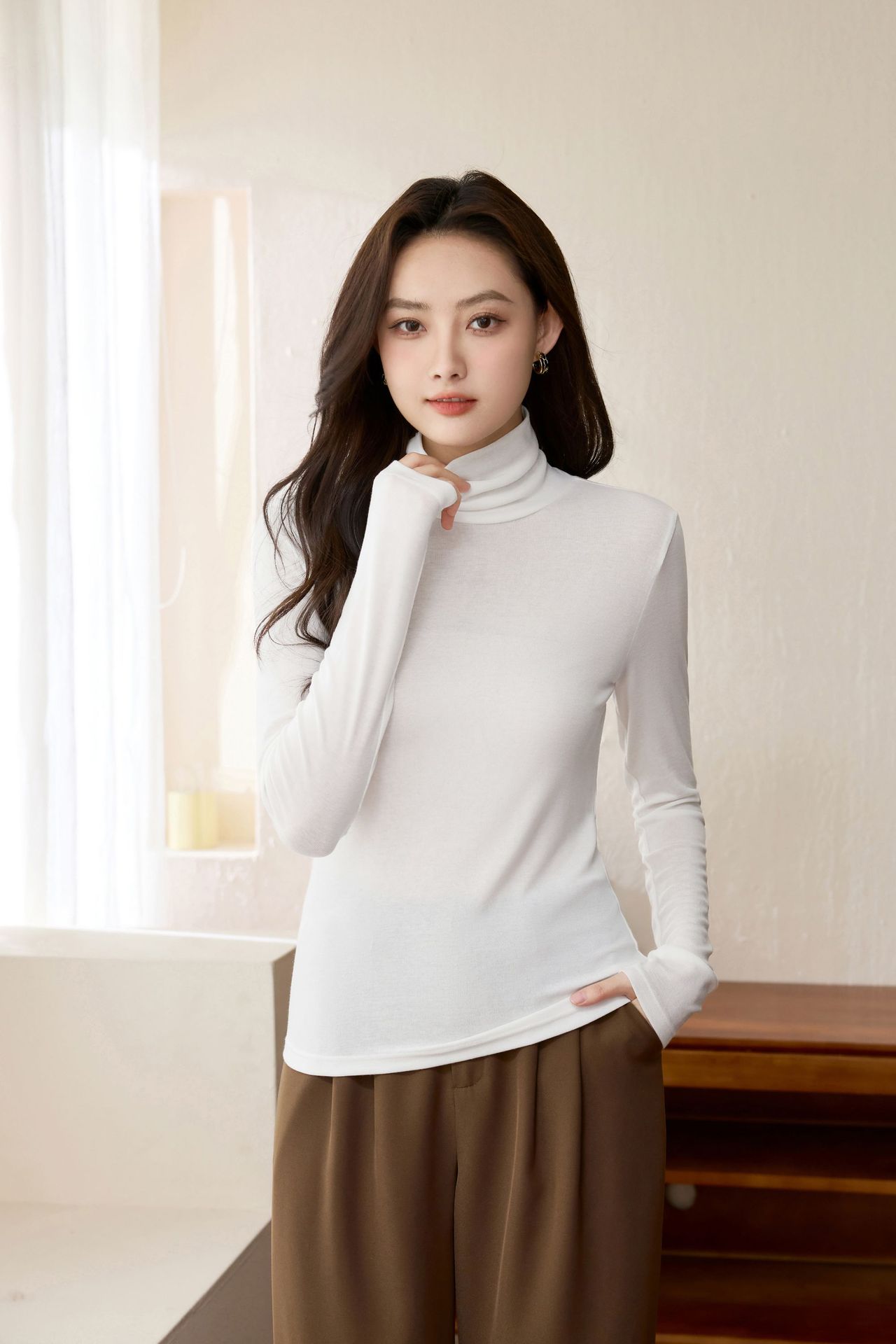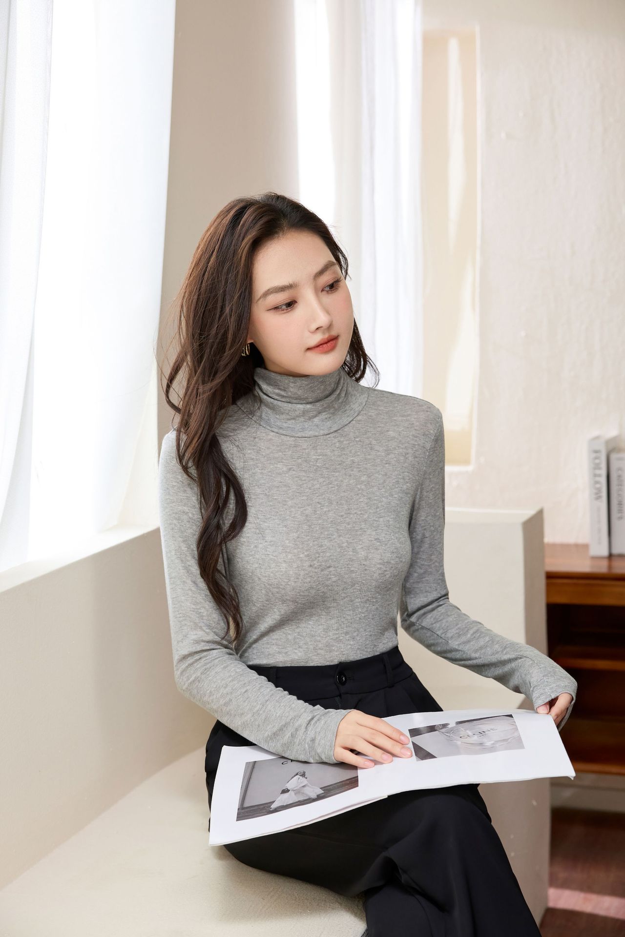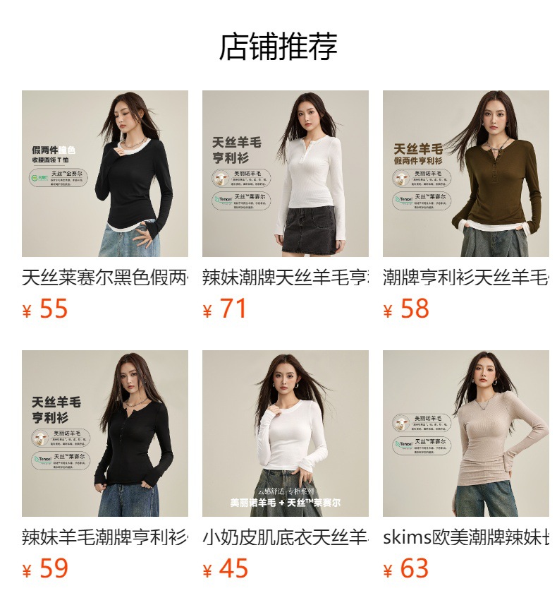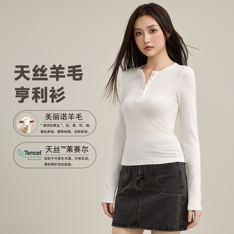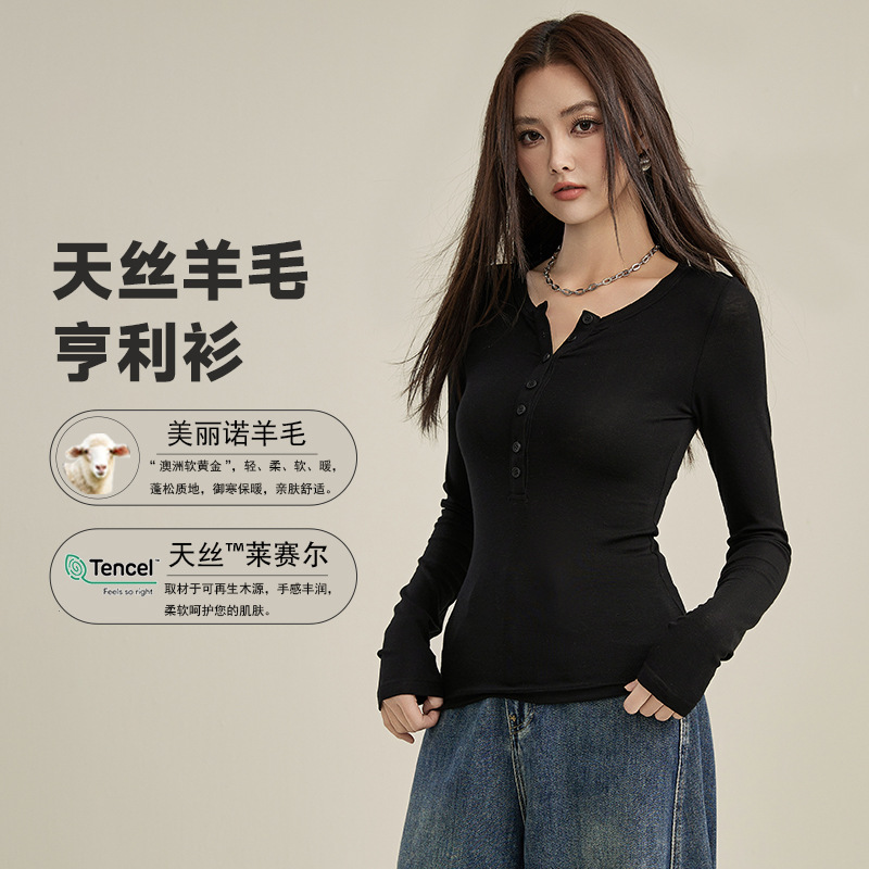 Two long-sleeved T-shirts for women in the spring of 2025, featuring a trendy Henry shirt, Tencel wool slimming fake, and a base layer top