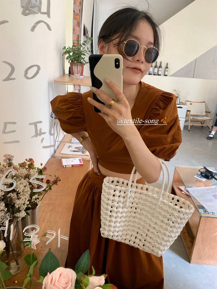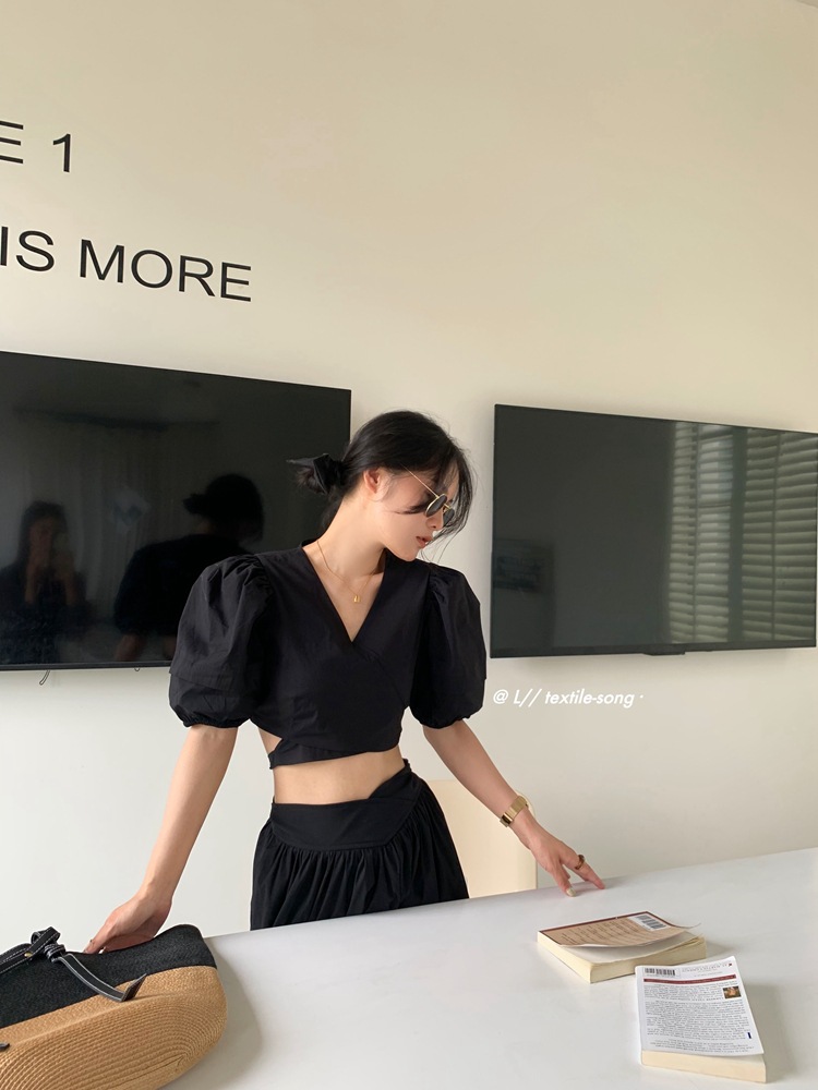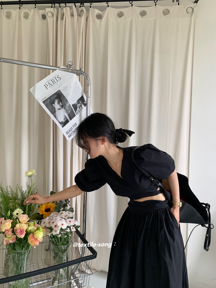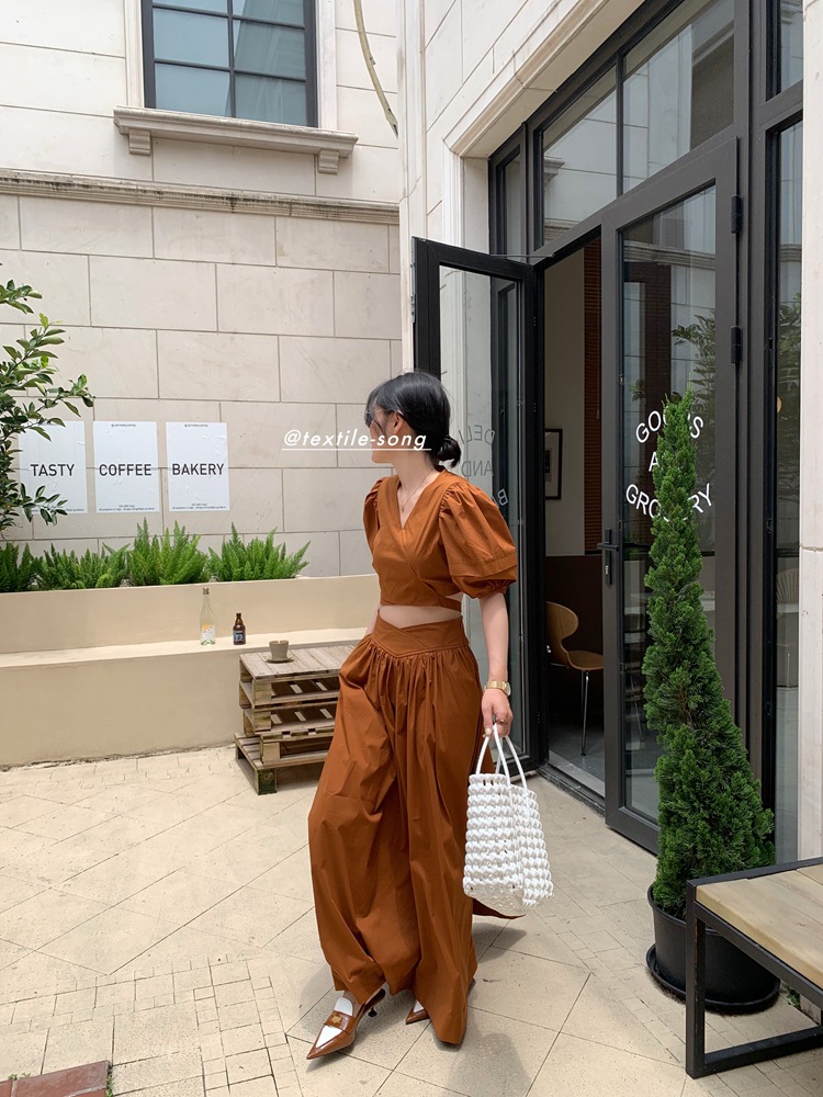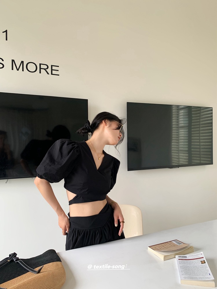 The body of the garment has no buttons, and the hem is designed with a tie tied around the waist, creating a visual effect of an ultra-thin waist