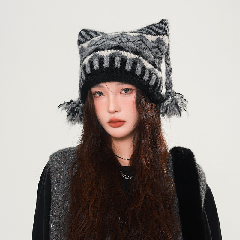 The 2025 new ethnic-style cat ear colorful striped woolen cap is a versatile and warm knitted cap for children and men in autumn and winter