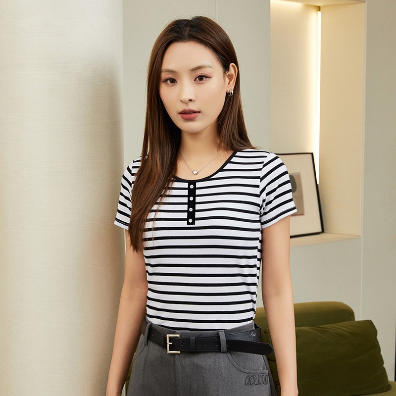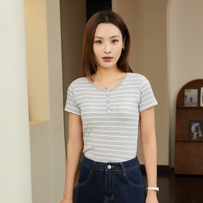 The 2025 new short-sleeved striped half-sleeved women's slimming wear is versatile. It can be worn as an outer layer and an inner layer with a leak-proof short-sleeved T-shirt as a base layer