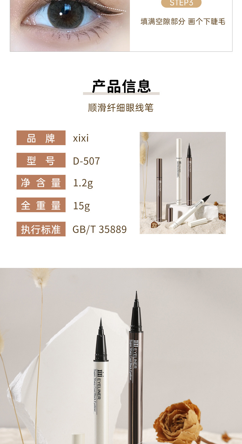 The makeup xixi is smooth and slender. The eyeliner is extremely fine, waterproof and won't smudge the eyes and face. It can be used to outline shadows