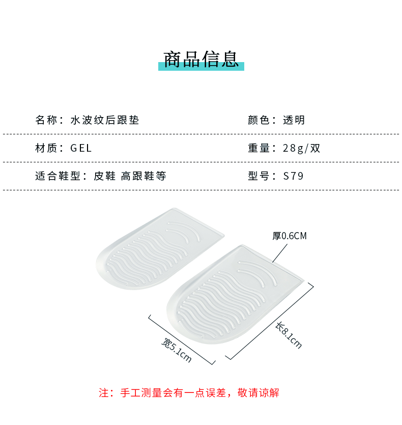 The manufacturer has water ripple transparent silicone heel pad in stock for anti-slip and shock-absorbing foot care. The heel pad is half a size and won't fall off