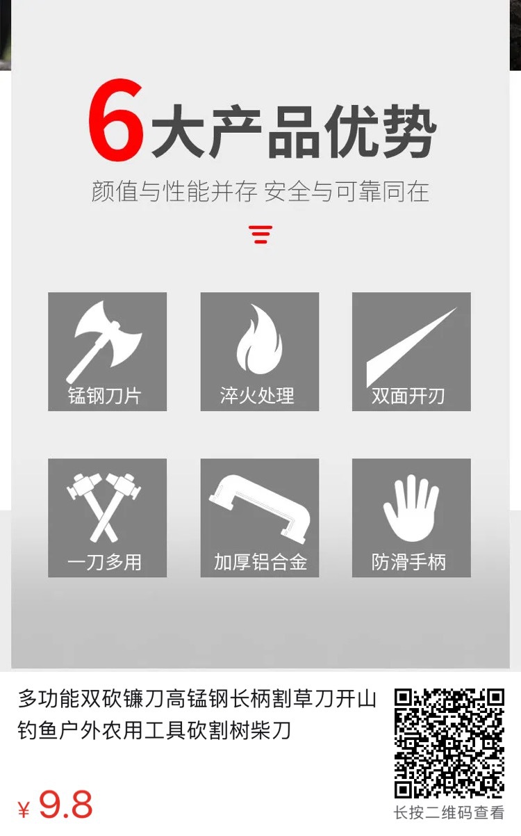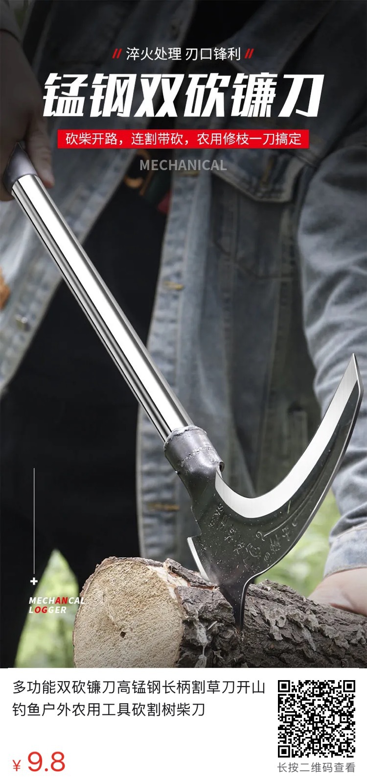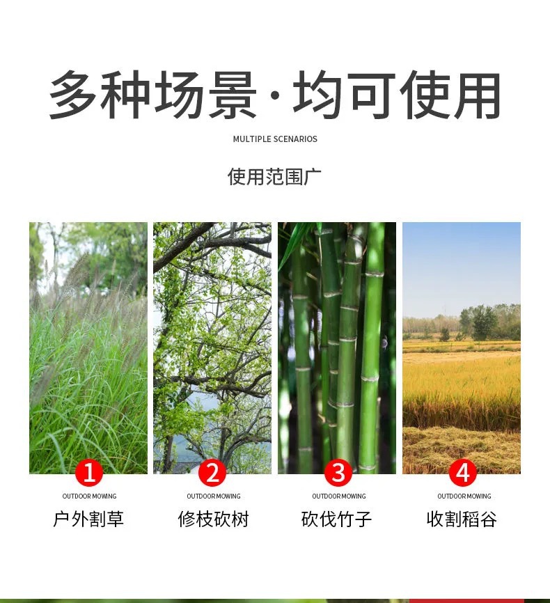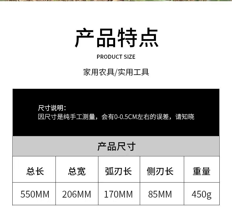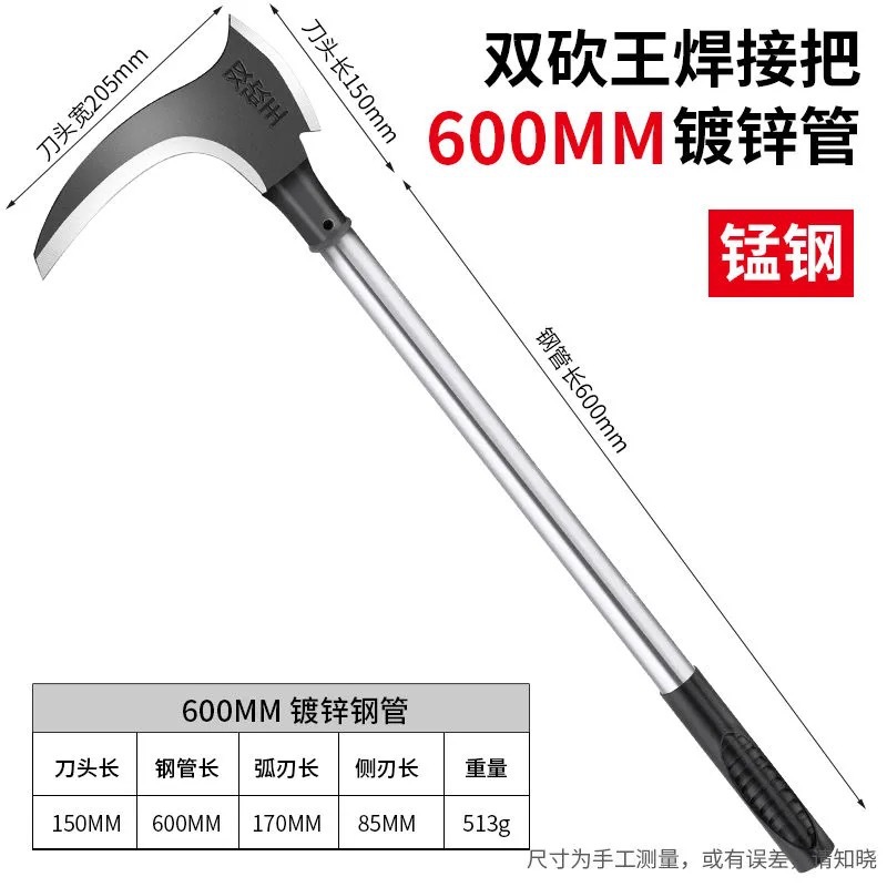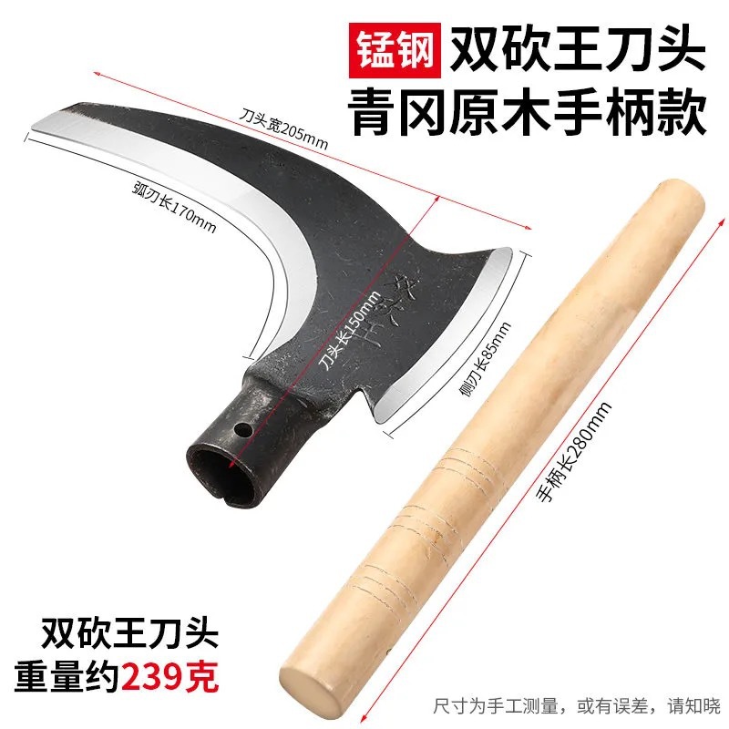 The manufacturer's double-chop sickle is used for harvesting straw and grass, outdoor mountain road driving, cutting branches and firewood, and is made of manganese steel