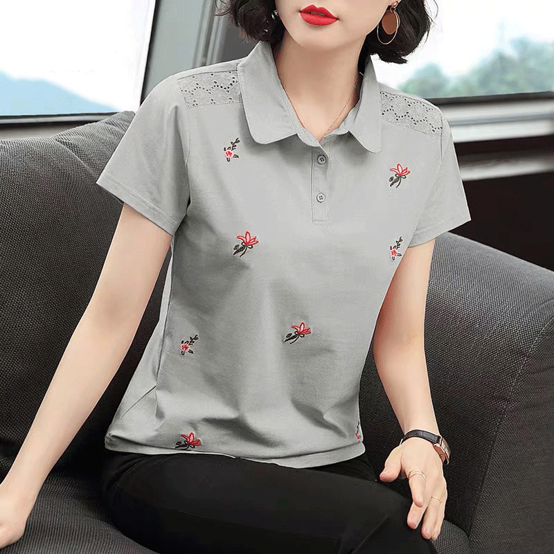 The new 2022 summer collection of pure cotton women's lapel short-sleeved T-shirt, loose large-sized embroidered collared polo shirt, trendy top