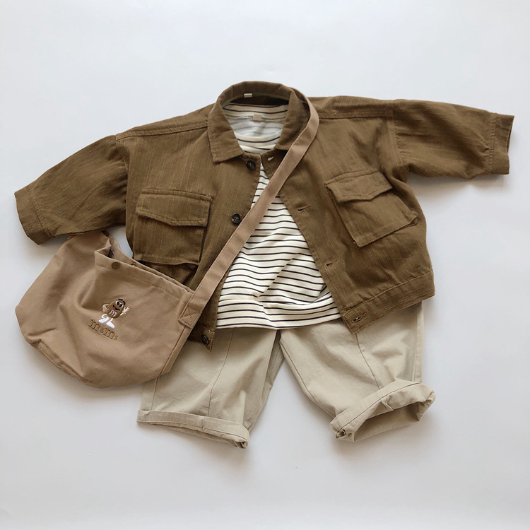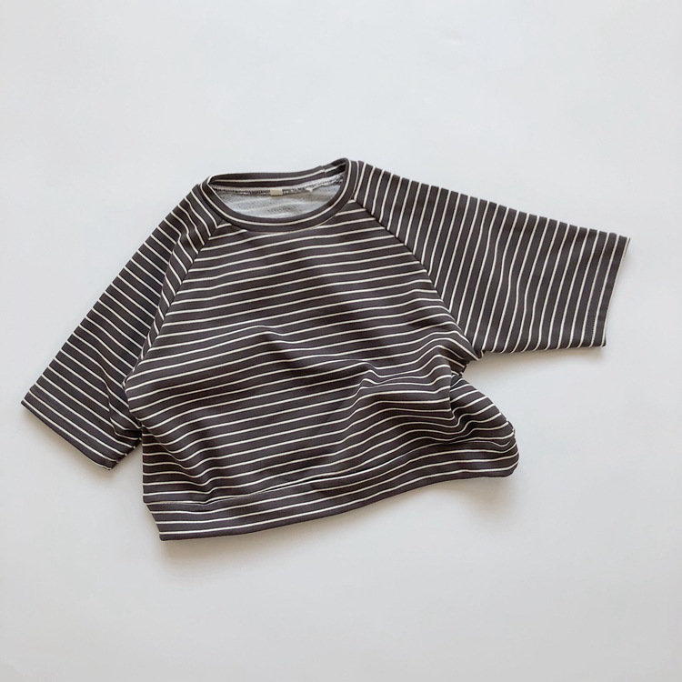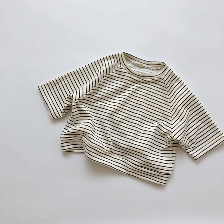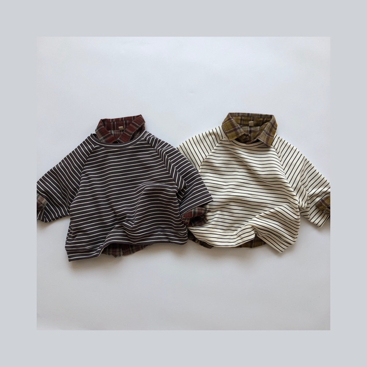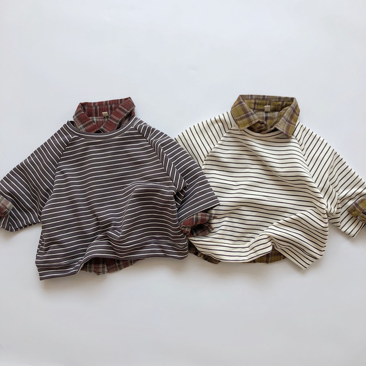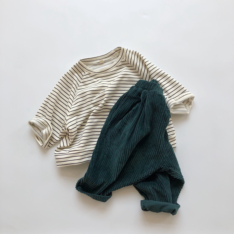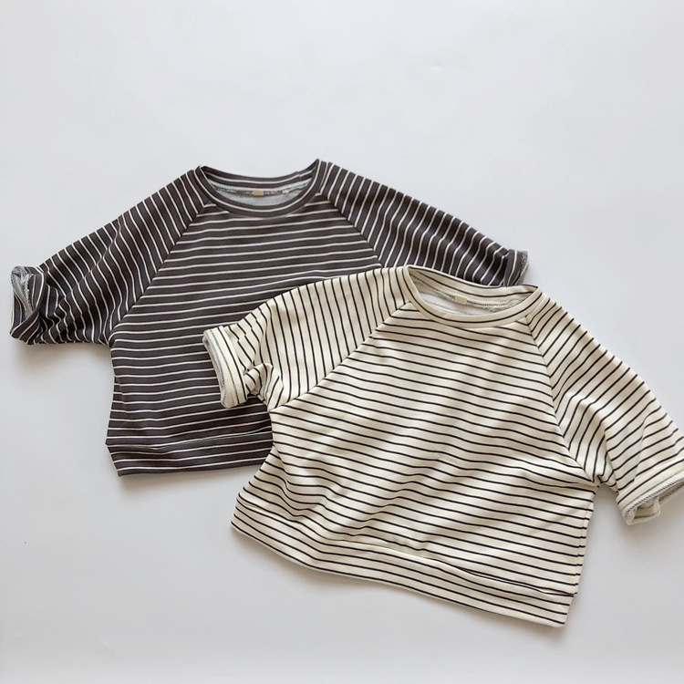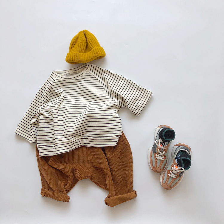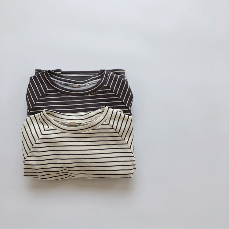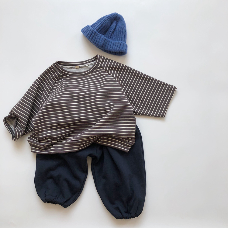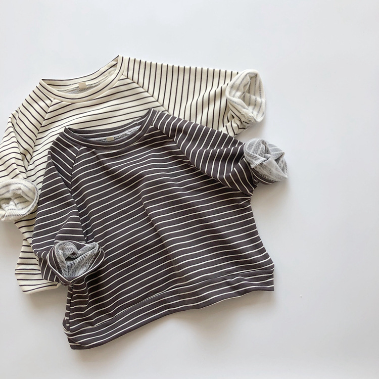The new Korean-style children's striped hoodie from Spring and Autumn features a colorful cotton and wool loop for both boys and girls, with a striped pullover and a round-neck top as the base