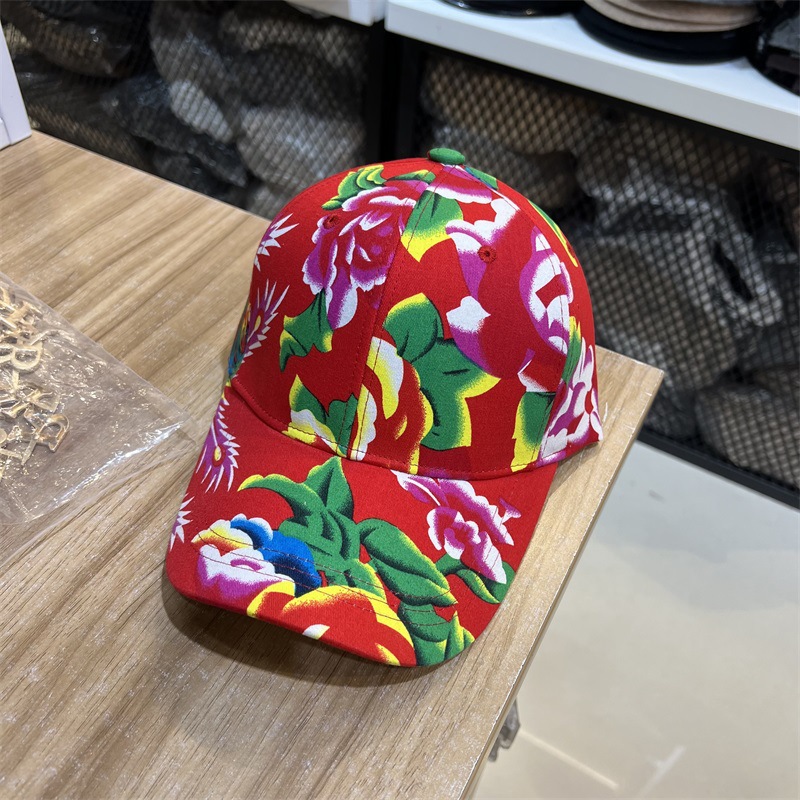 The new large flowered baseball cap from Northeast China is a street style with a unique personality, suitable for both men and women, and has a festive atmosphere. The red baseball cap with a national trend is in vogue