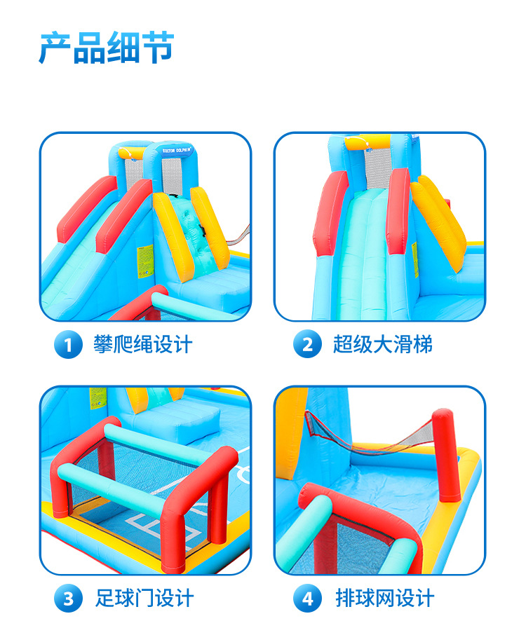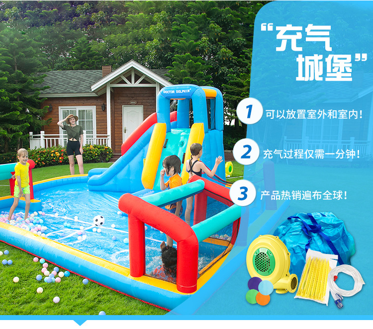 The new outdoor inflatable castle slide of Doctor Dolphin comes with a shooting children's play room and a water play inflatable slide