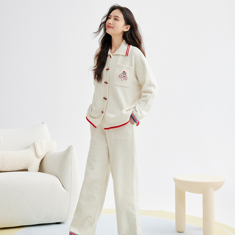 Thickened autumn and winter women's half-fleece pajama set, lapel contrasting color piping, warm and casual home wear for women