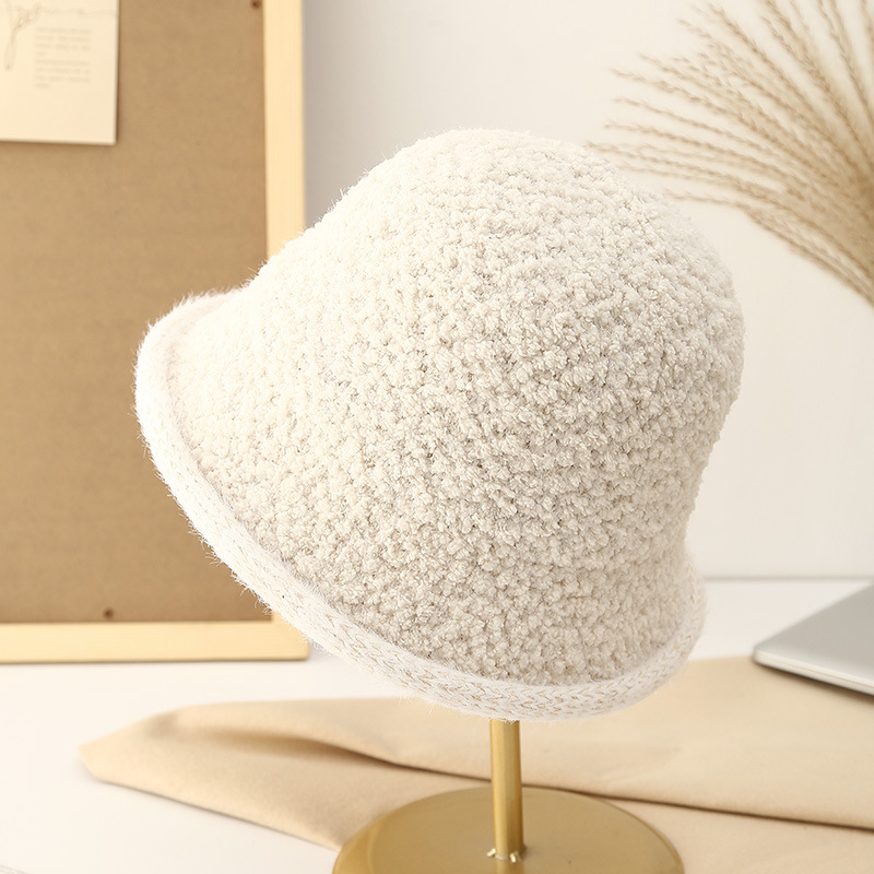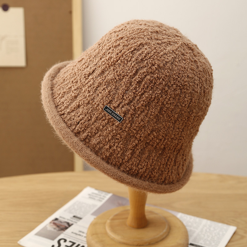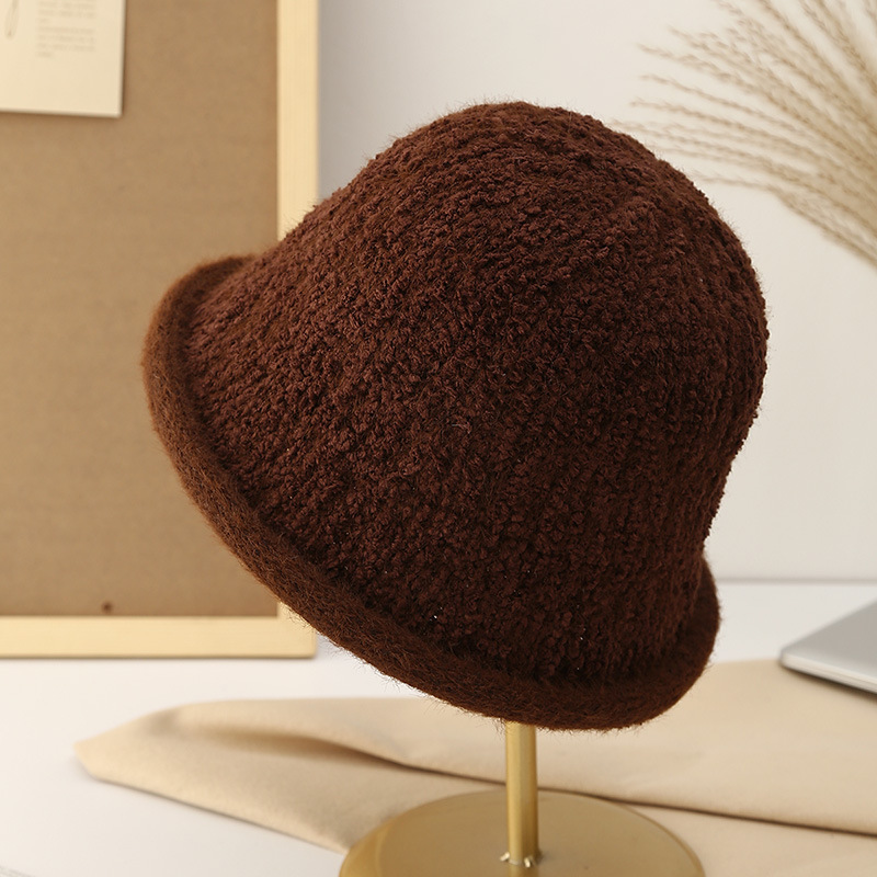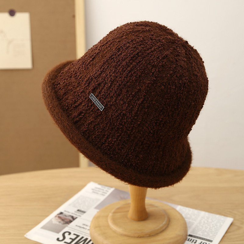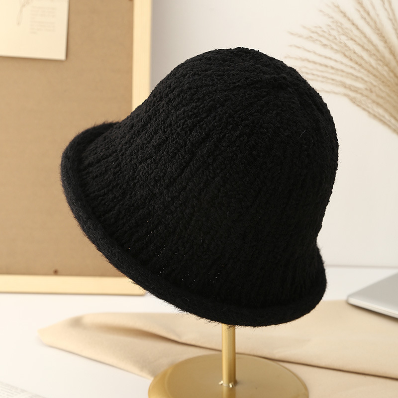 This autumn and winter knitted basin hat is a versatile match for women. It features a lambskin texture, a round top hat, a Korean fisherman's hat, and a black label woolen hat. It's artistic