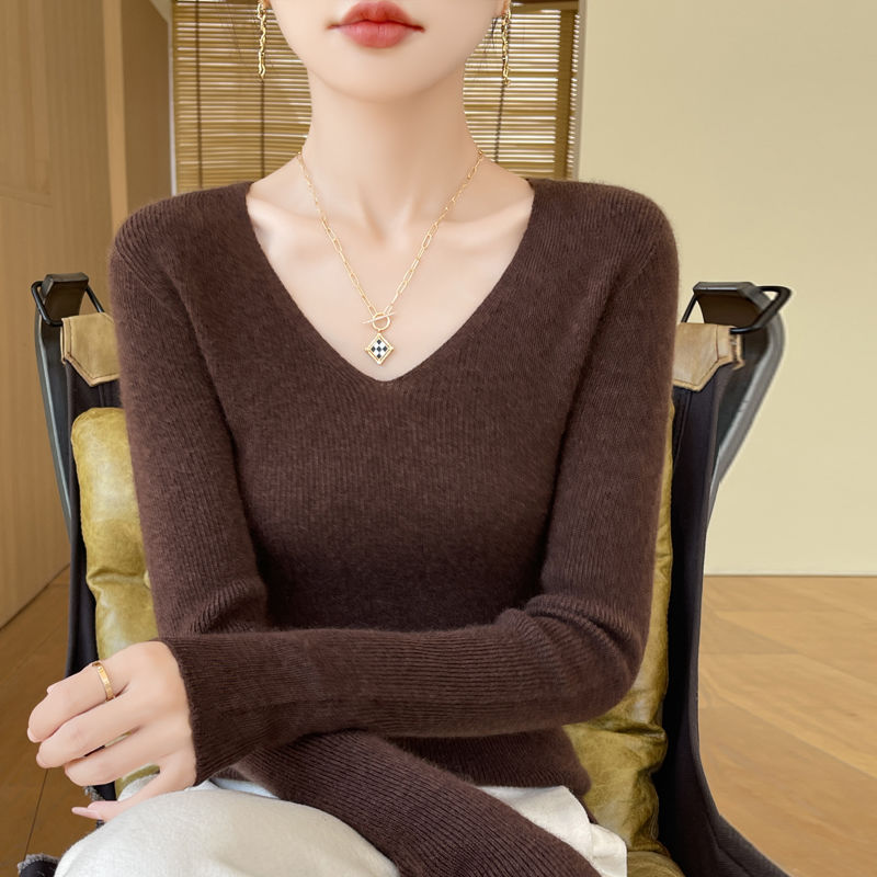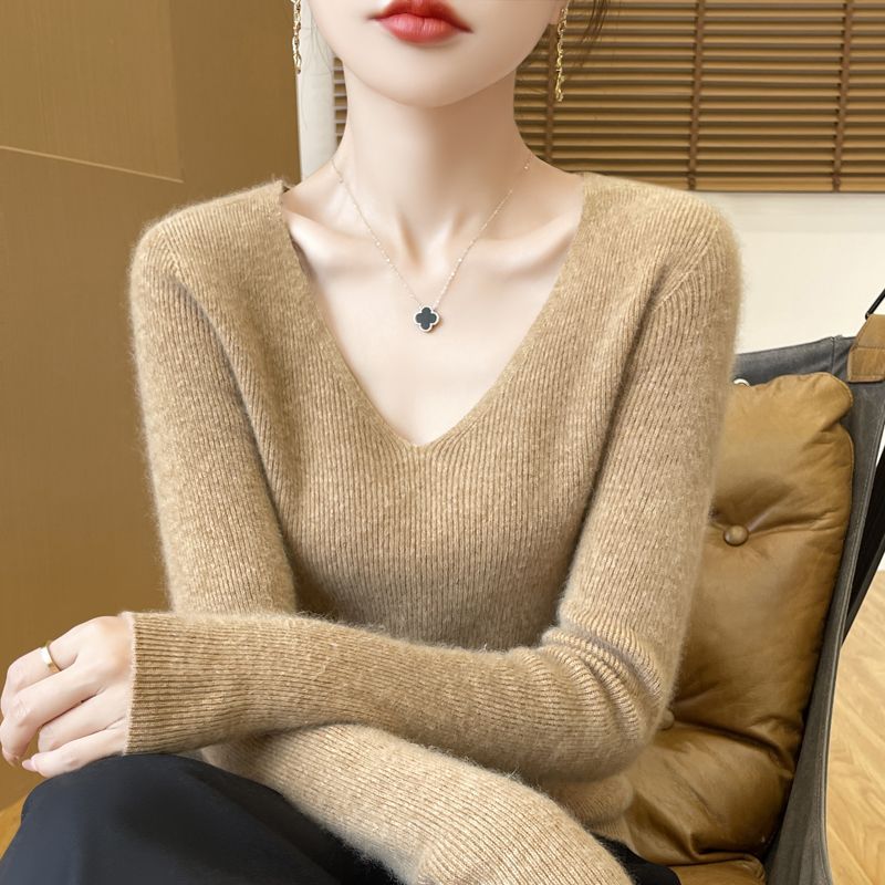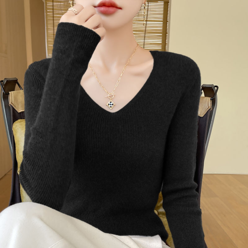 This autumn and winter new style of wool sweater features a V-neck that is slimming and versatile. It is a long-sleeved, casual and elegant sweater with a base layer of knitted sweater for women