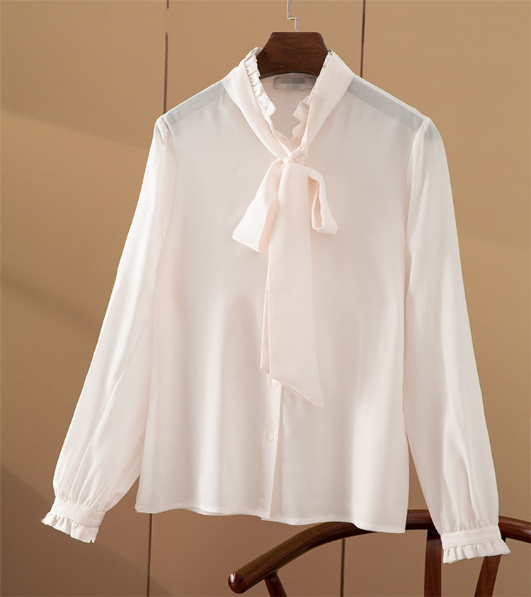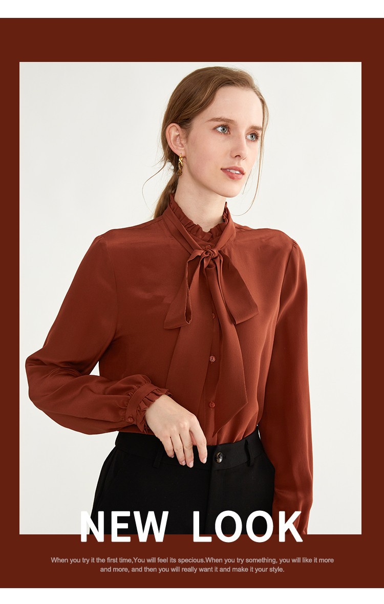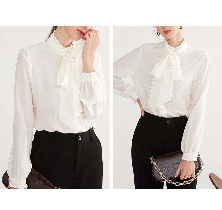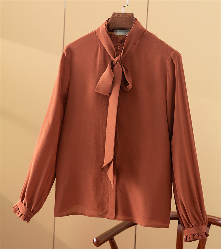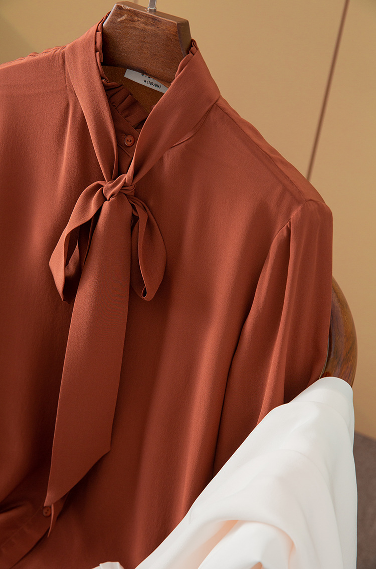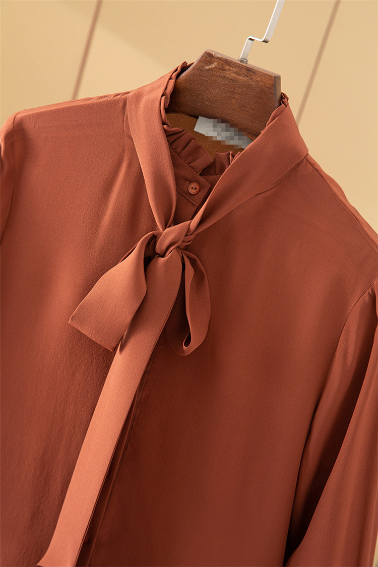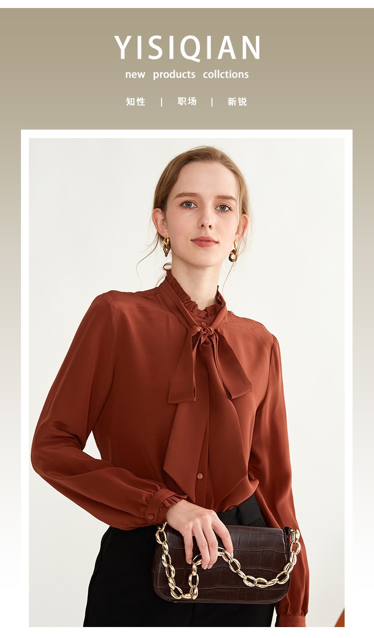 This is a light luxury women's silk shirt in a solid color with a black ear trim design and a niche ribbon base layer. It is a mulberry silk shirt