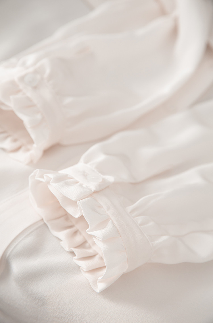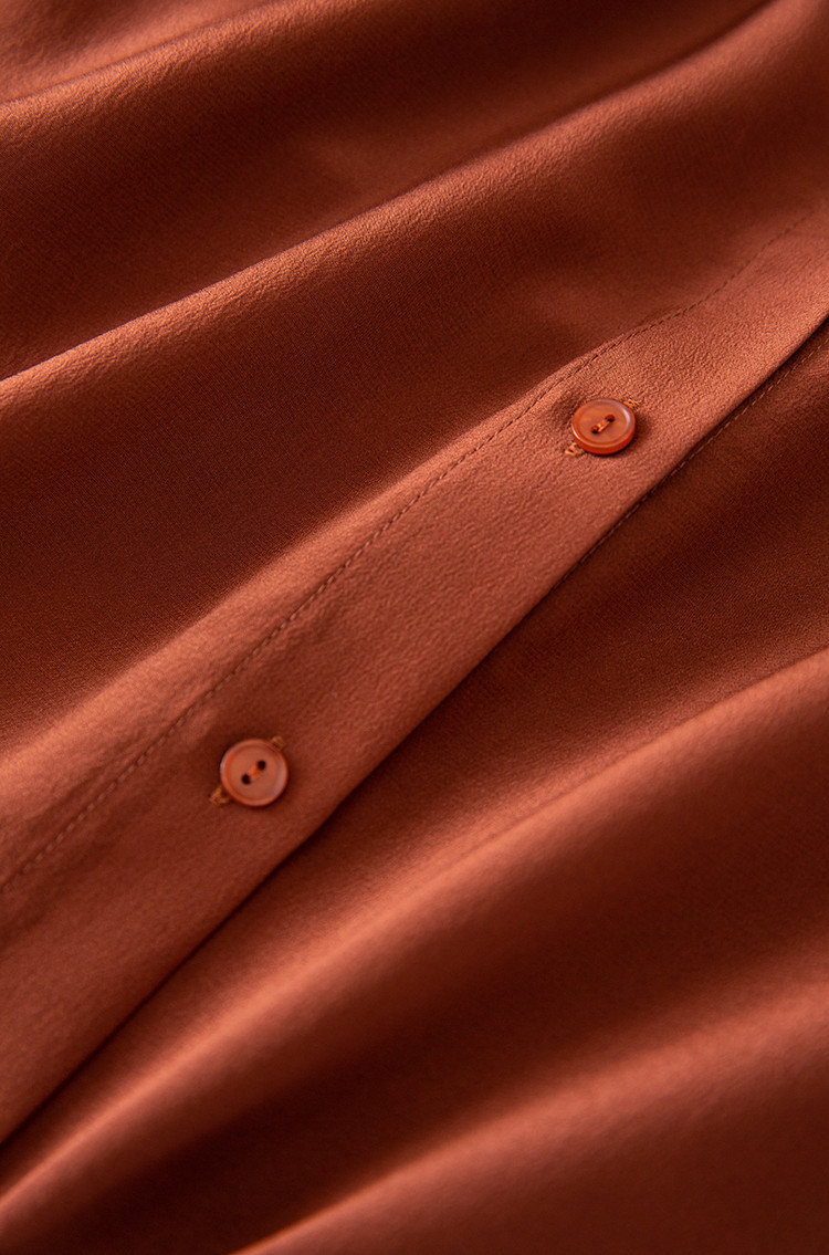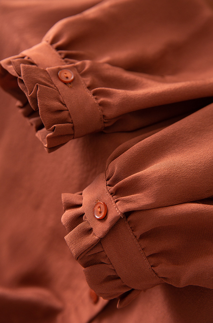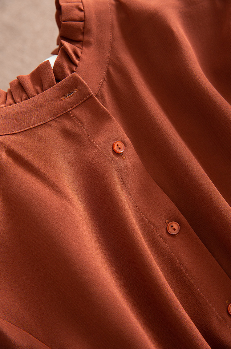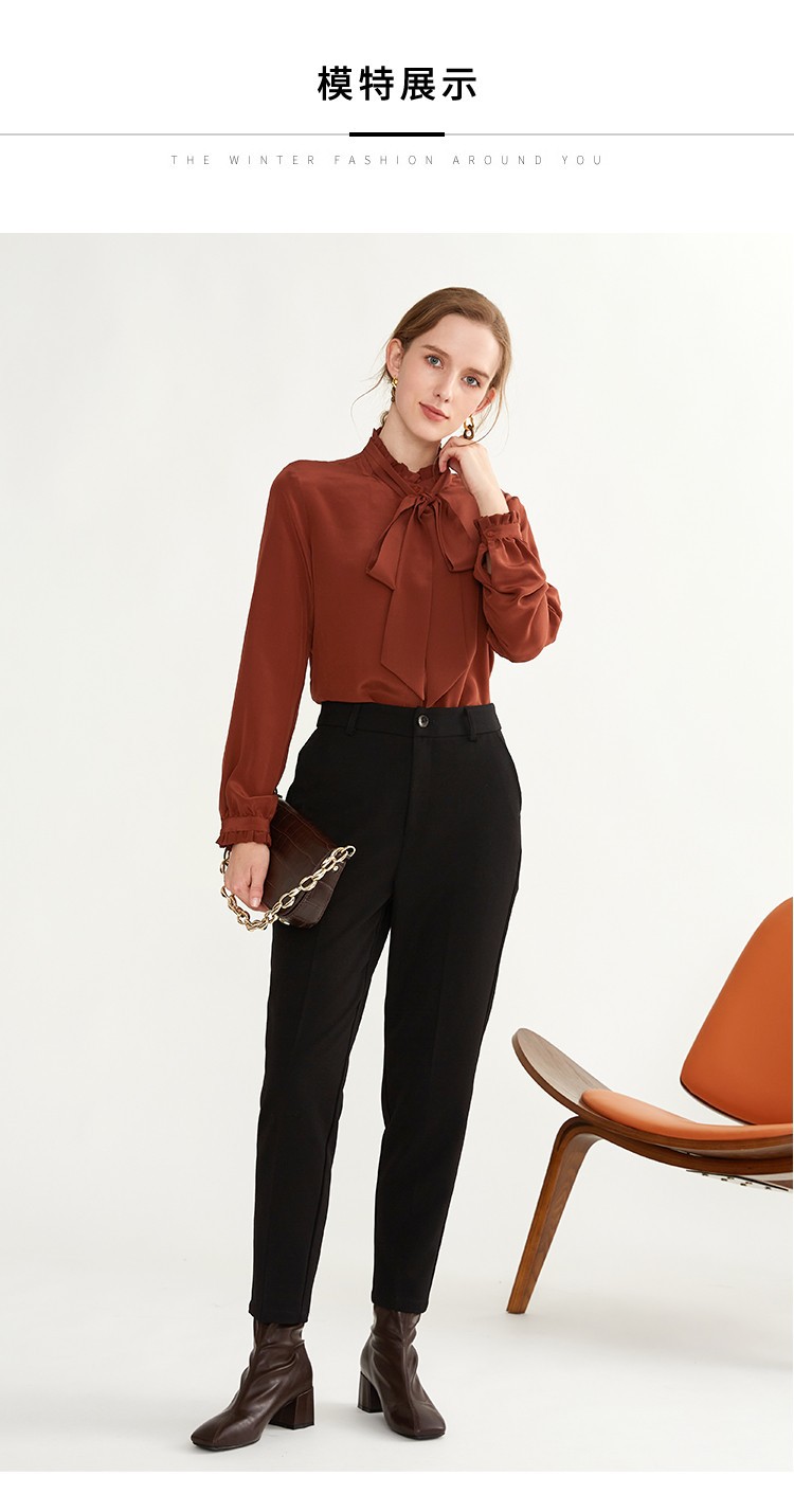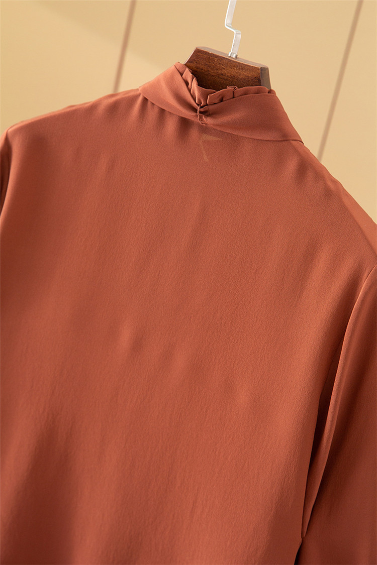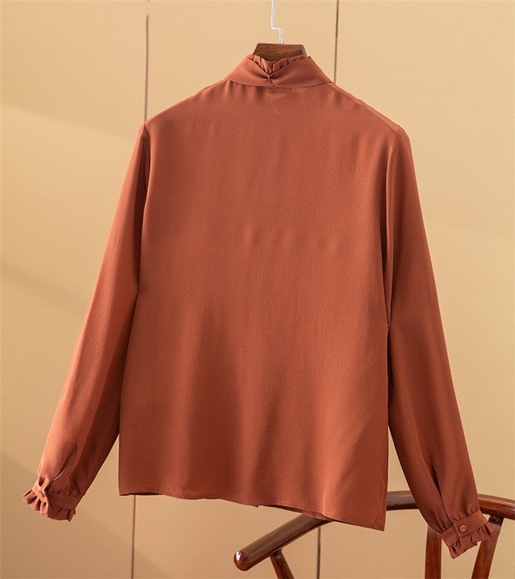 This is a light luxury women's silk shirt in a solid color with a black ear trim design and a niche ribbon base layer. It is a mulberry silk shirt