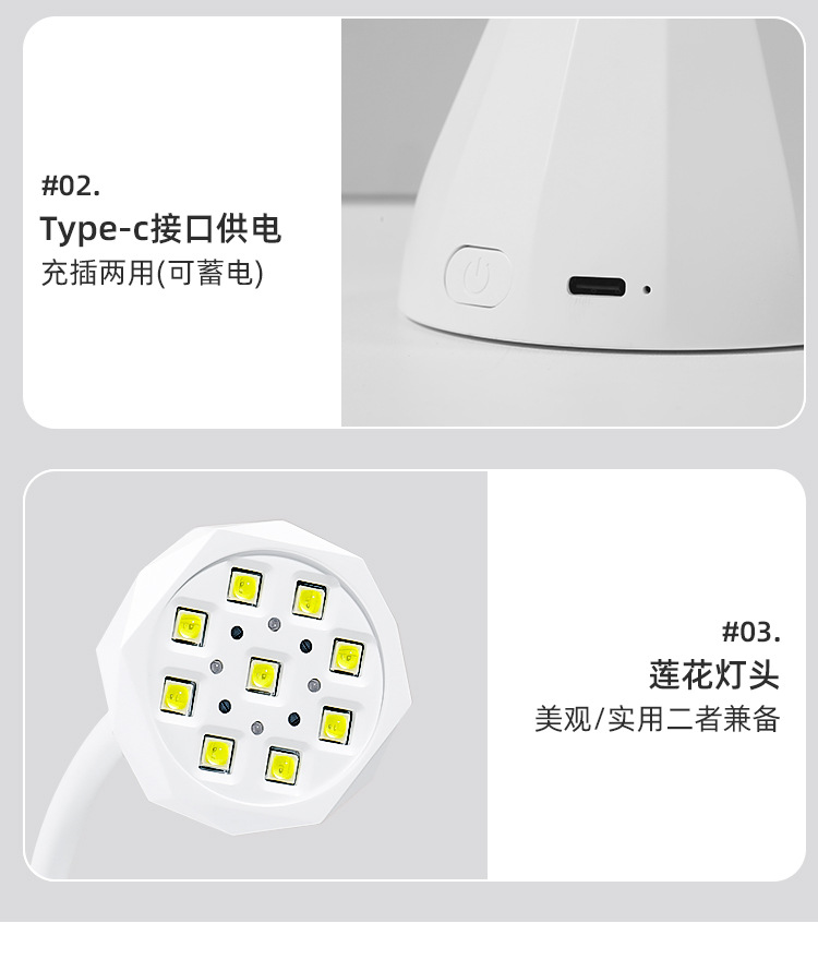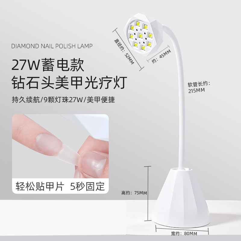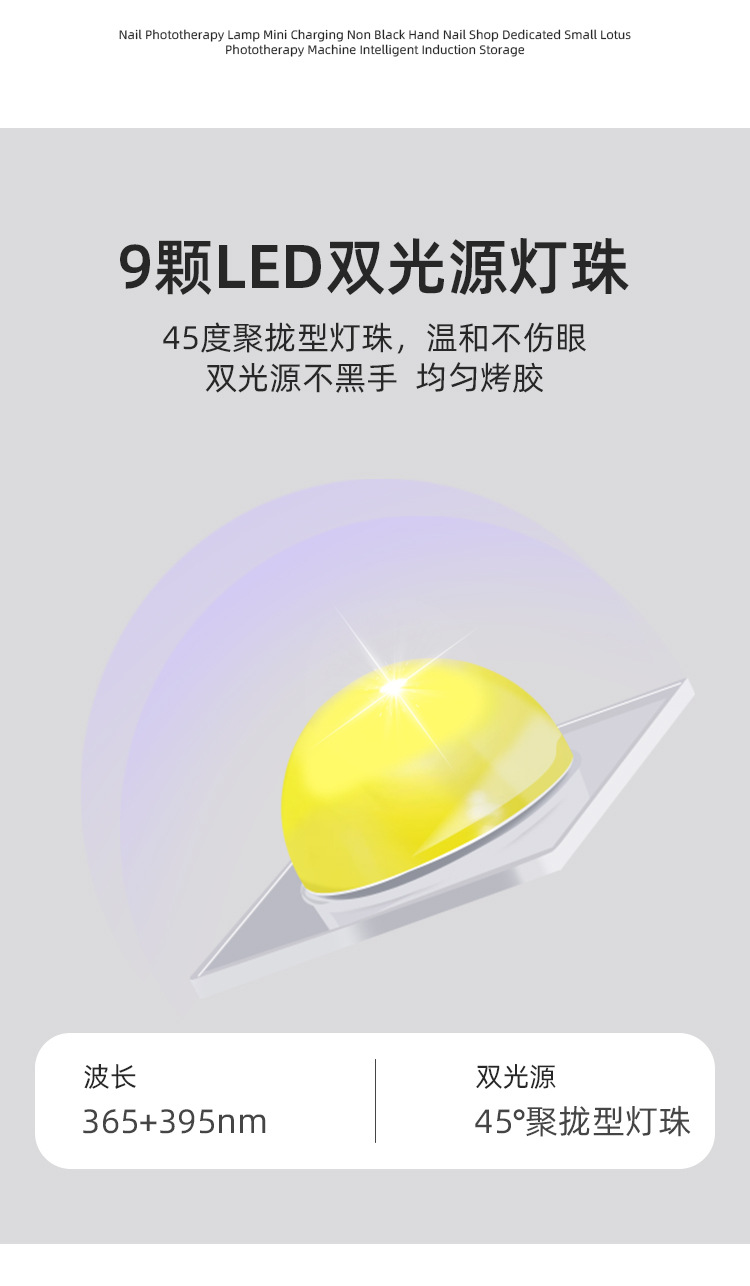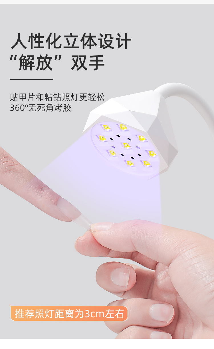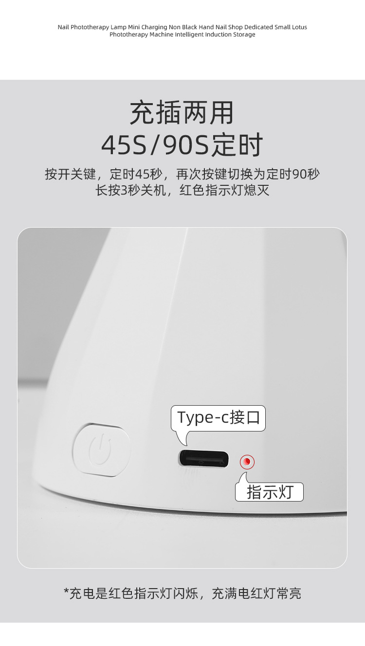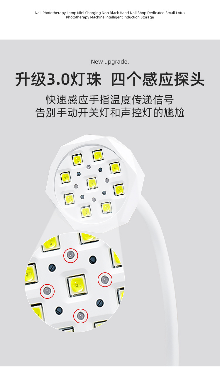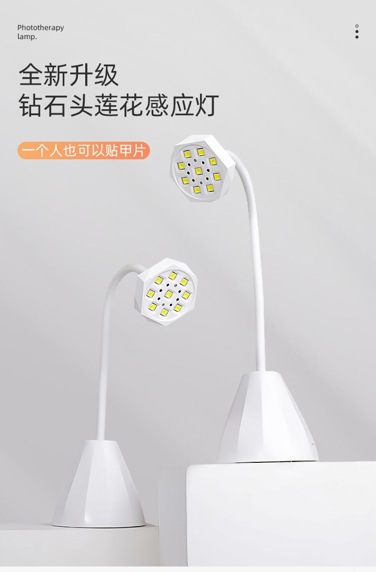 This is a small light therapy lamp designed for nail salons, featuring an intelligent sensor, battery storage and charging function that won't blacken your hands