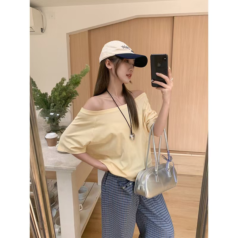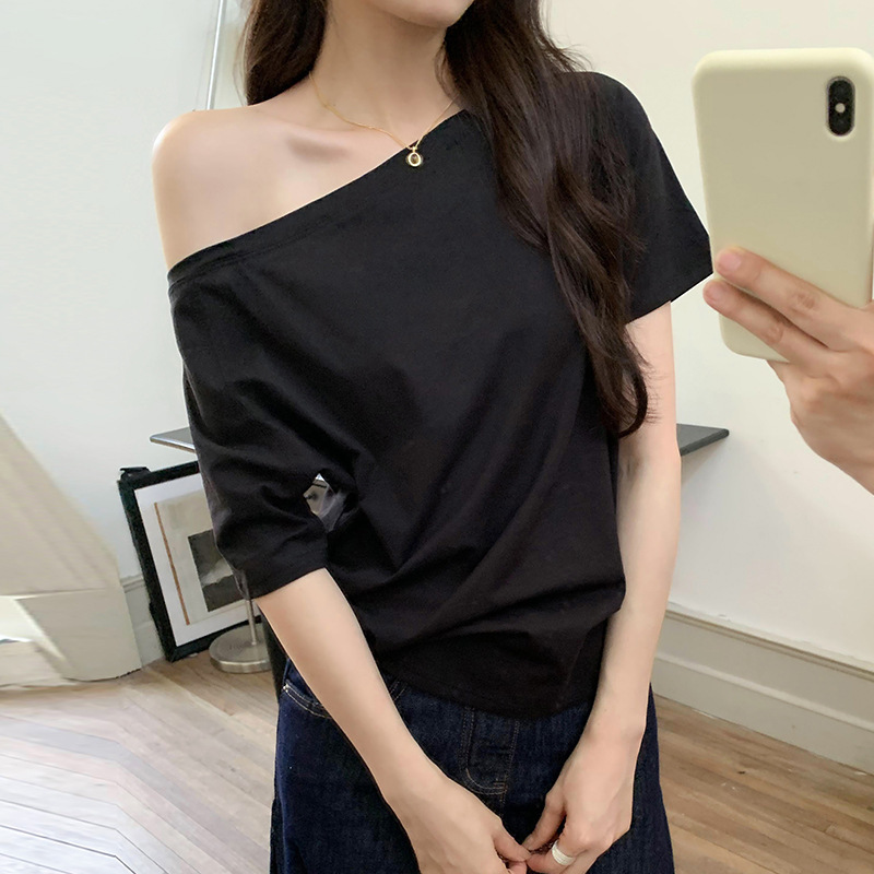 This is a star-style off-the-shoulder short-sleeved T-shirt for women. It's a loose black one-shoulder top that makes you want to be a hot girl