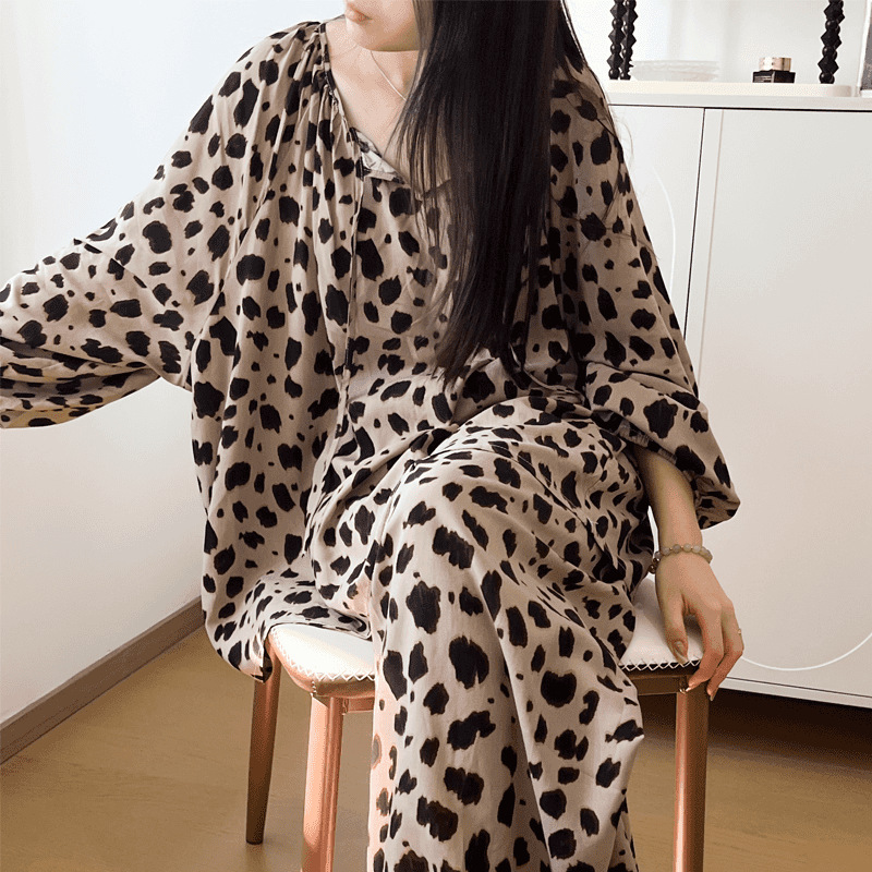 This laid-back and fashionable pajama with loose and casual printed patterns is a Chinese-style home wear set that can be worn over thin long-sleeved shirts