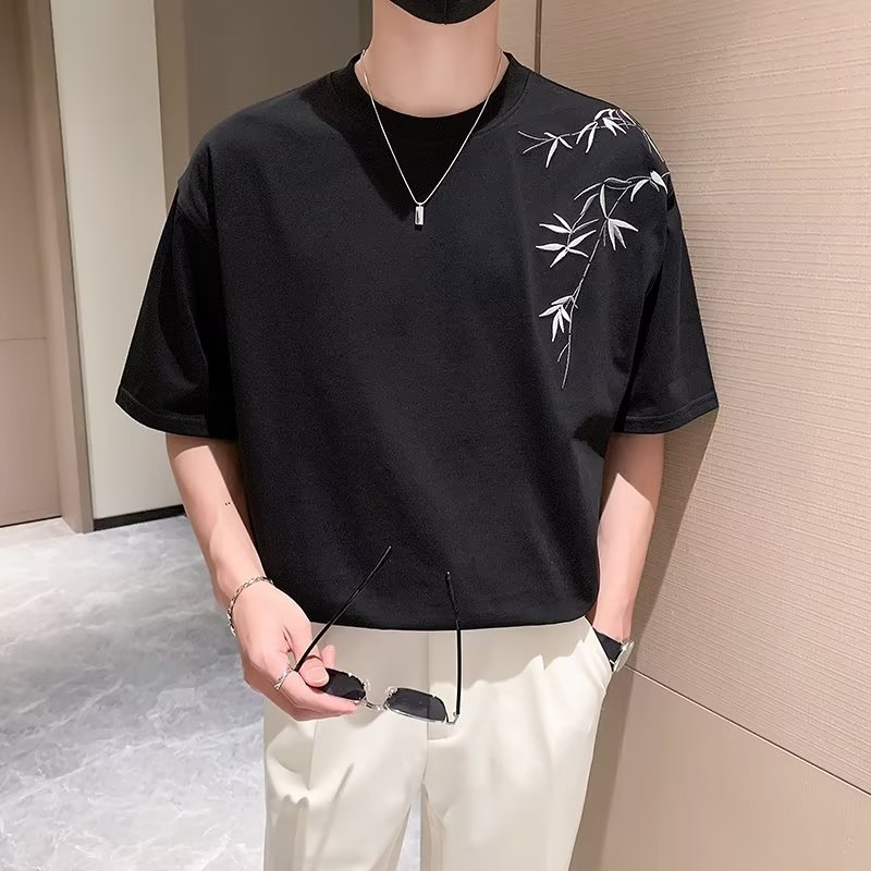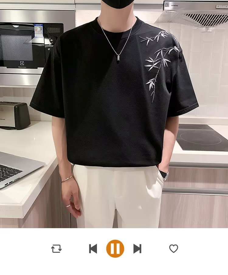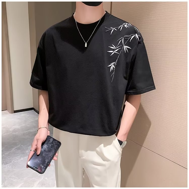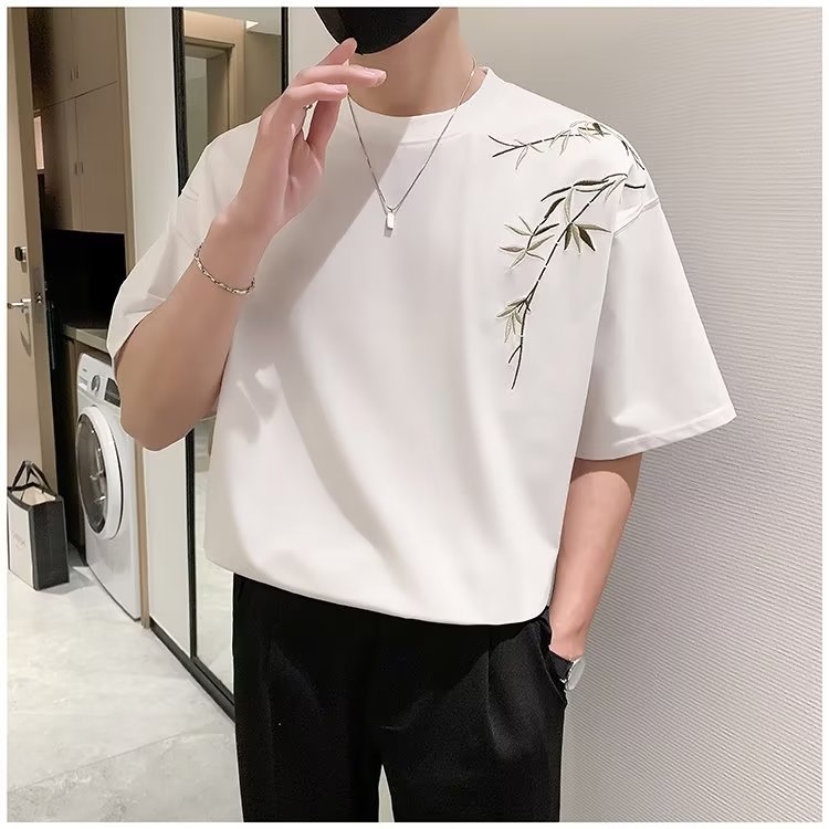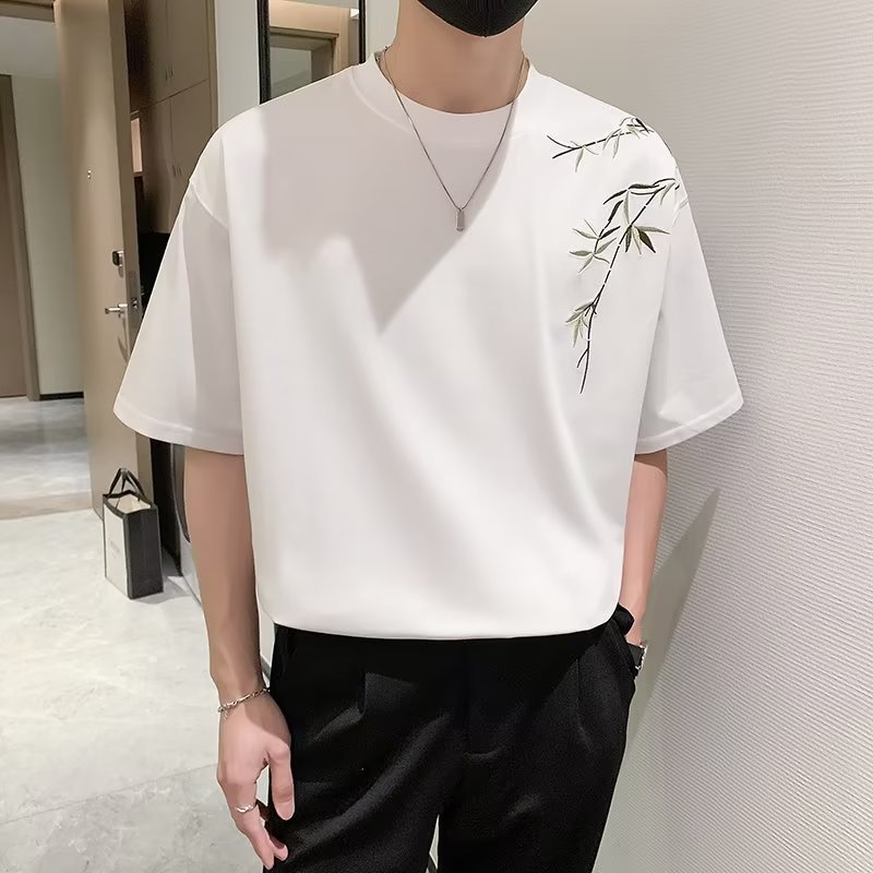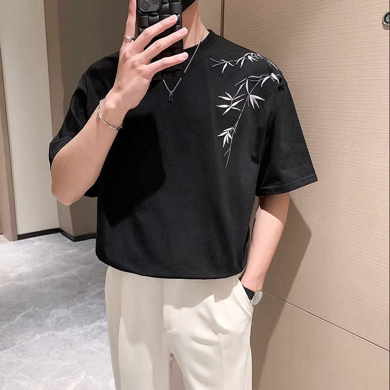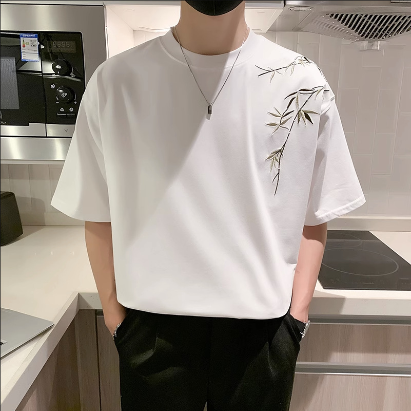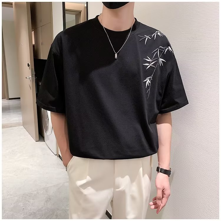 This short-sleeved T-shirt with a sense of artistic bamboo embroidery and a thin design for men, featuring a loose and casual Chinese style, is a versatile couple's T-shirt