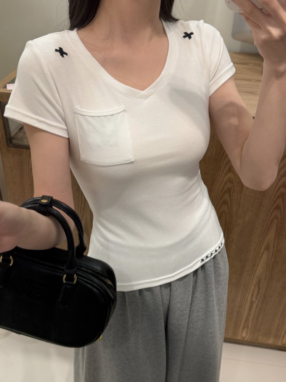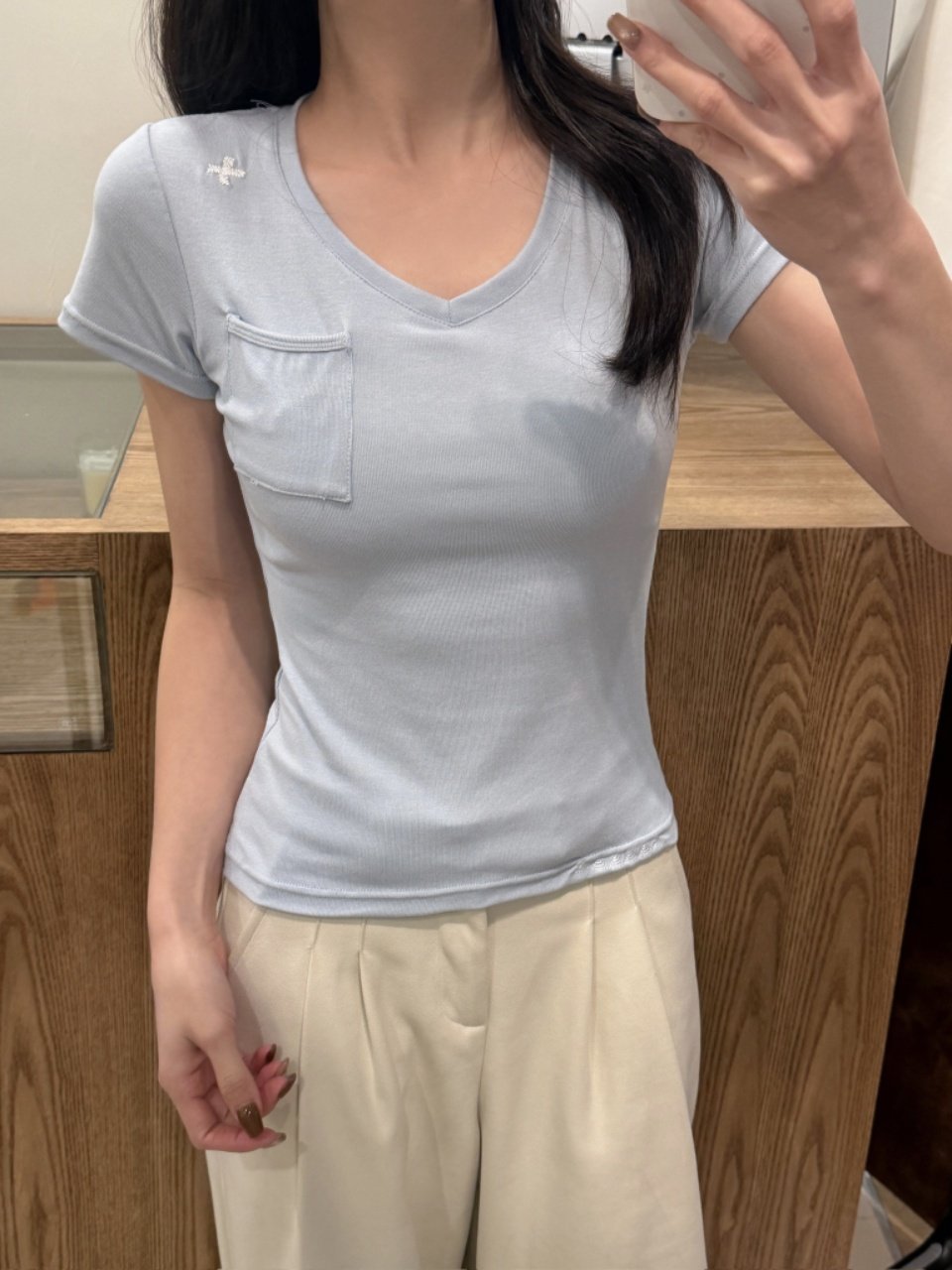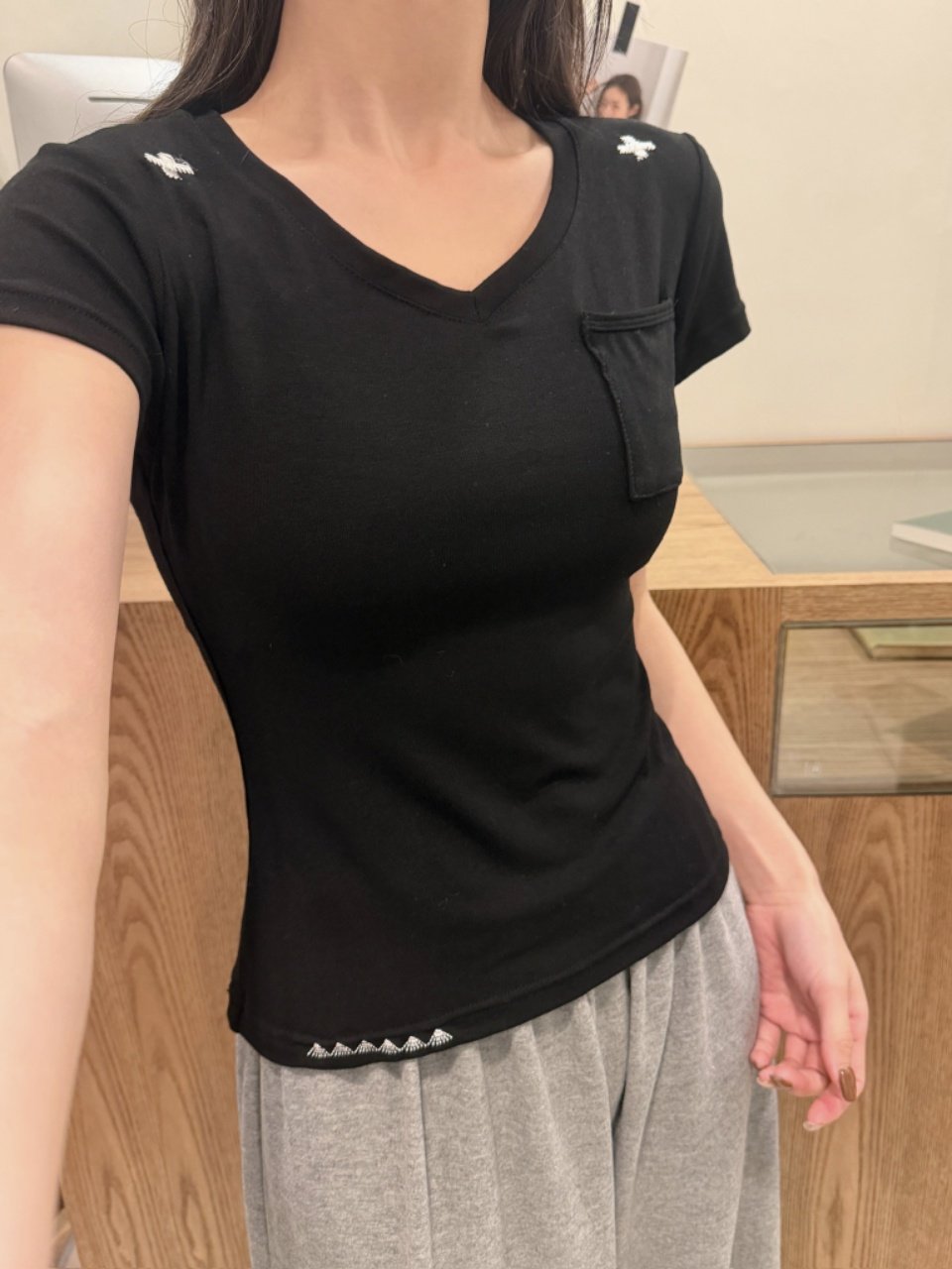 This simple embroidered V-neck short-sleeved T-shirt is suitable for women to wear as an inner or outer layer in summer. It is a versatile and casual design with a pocket