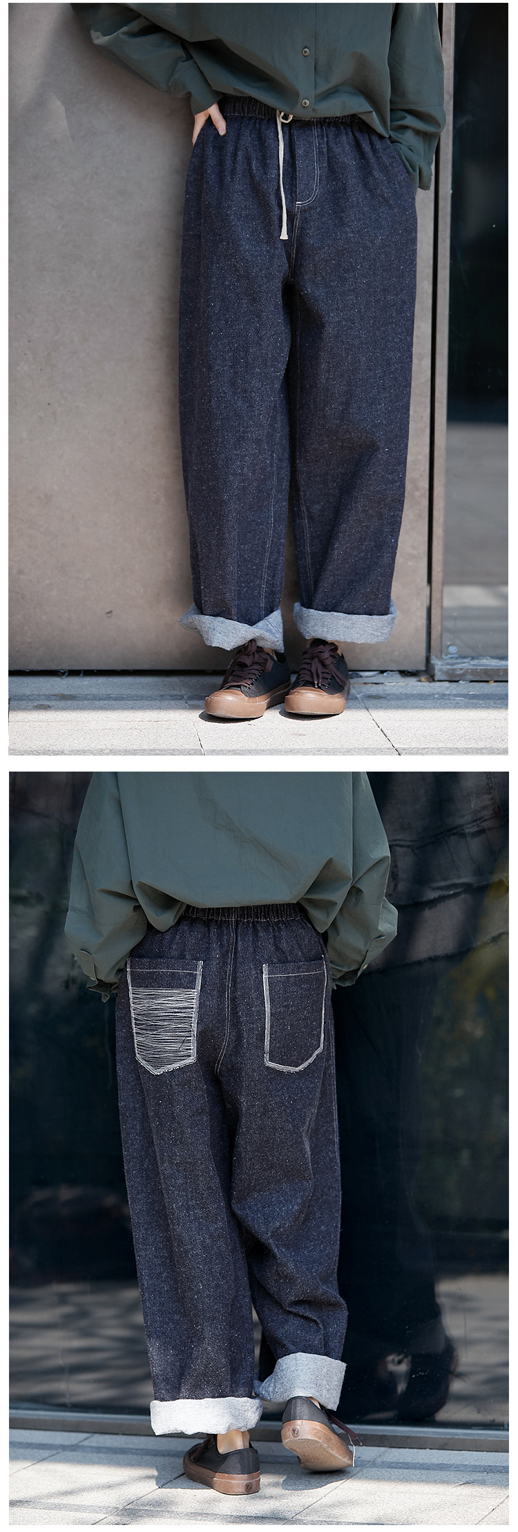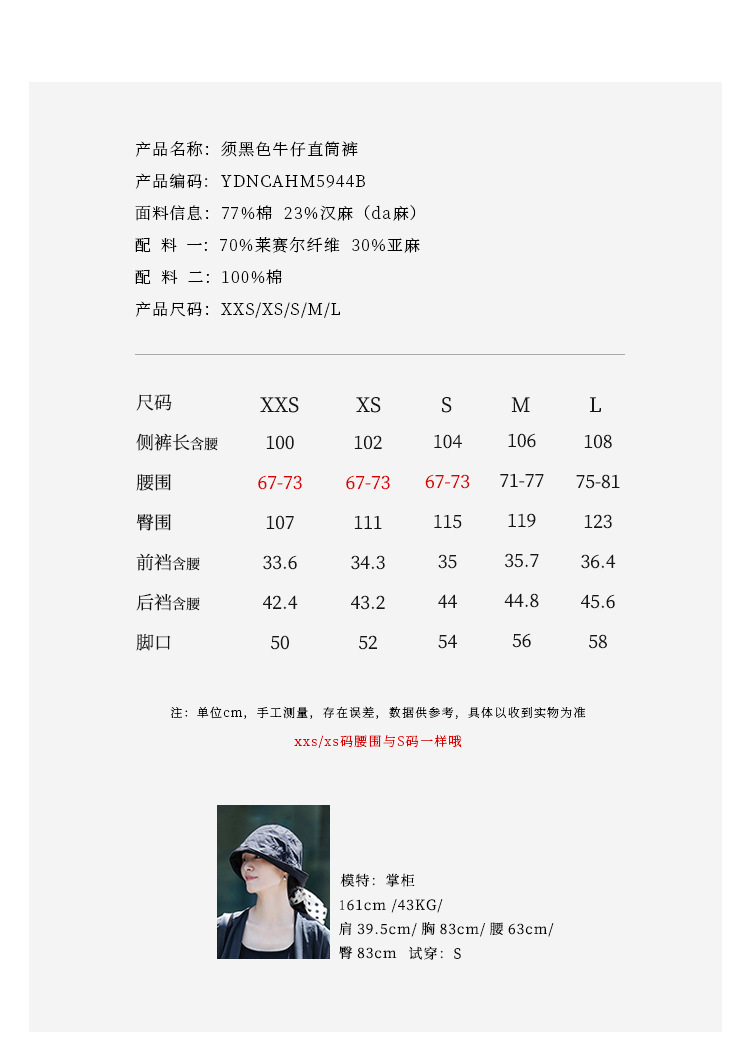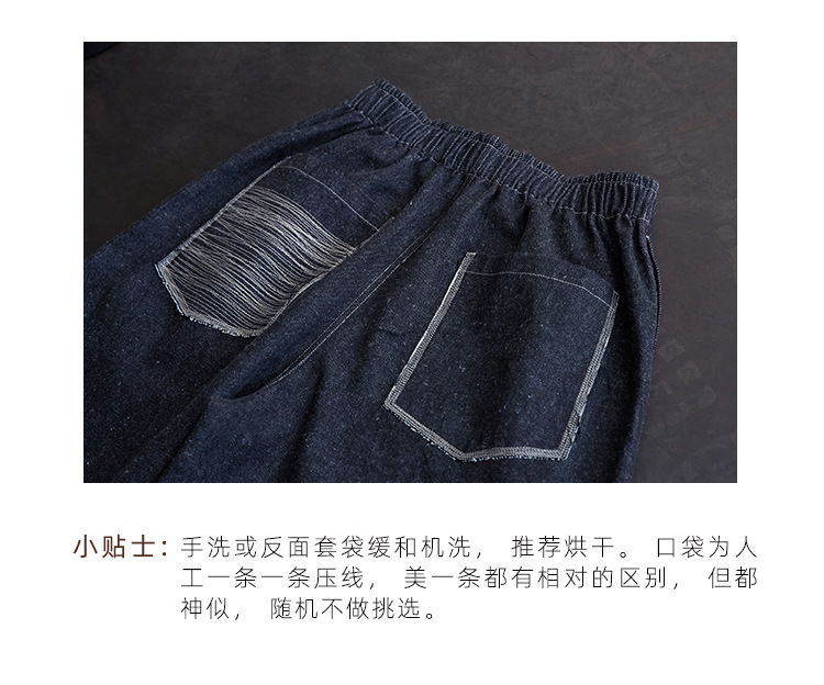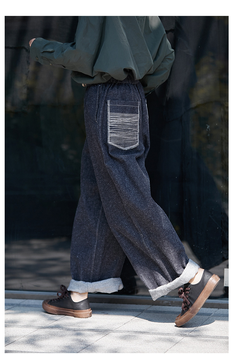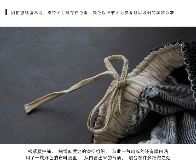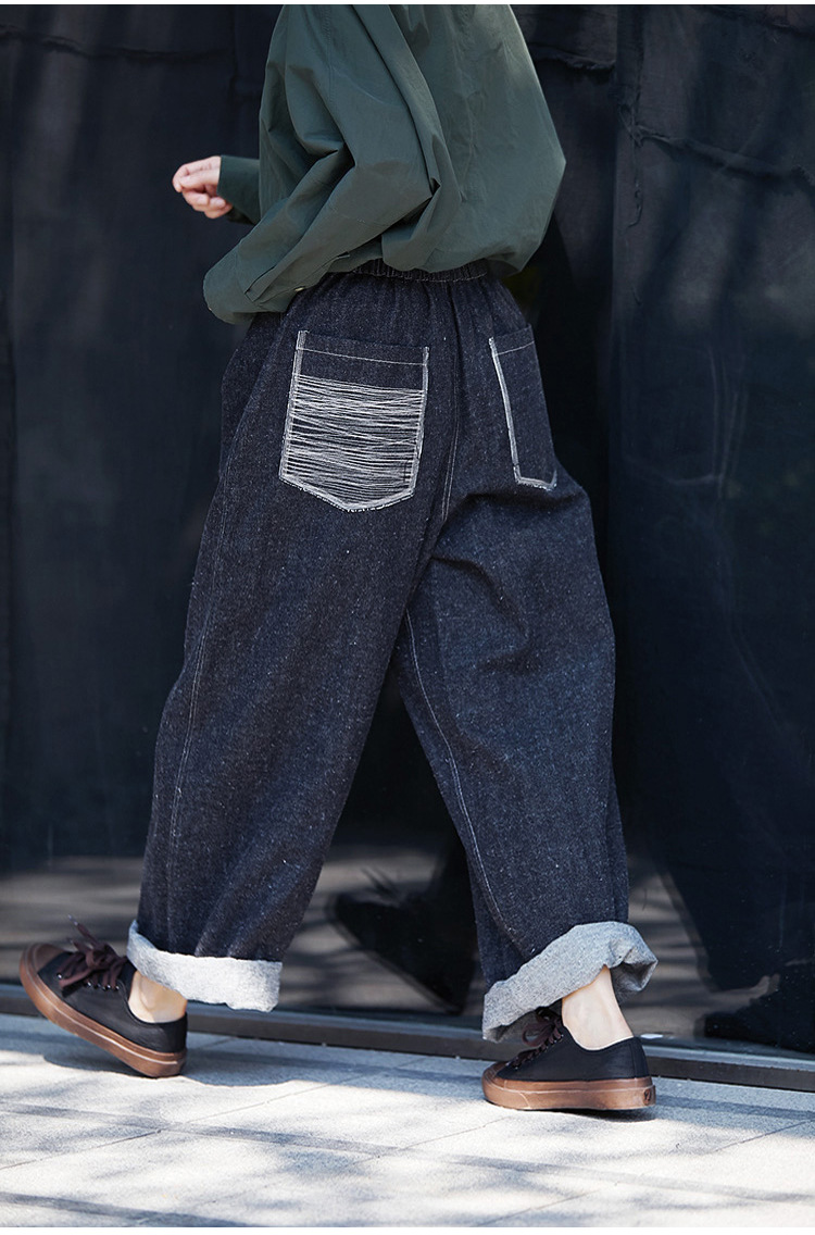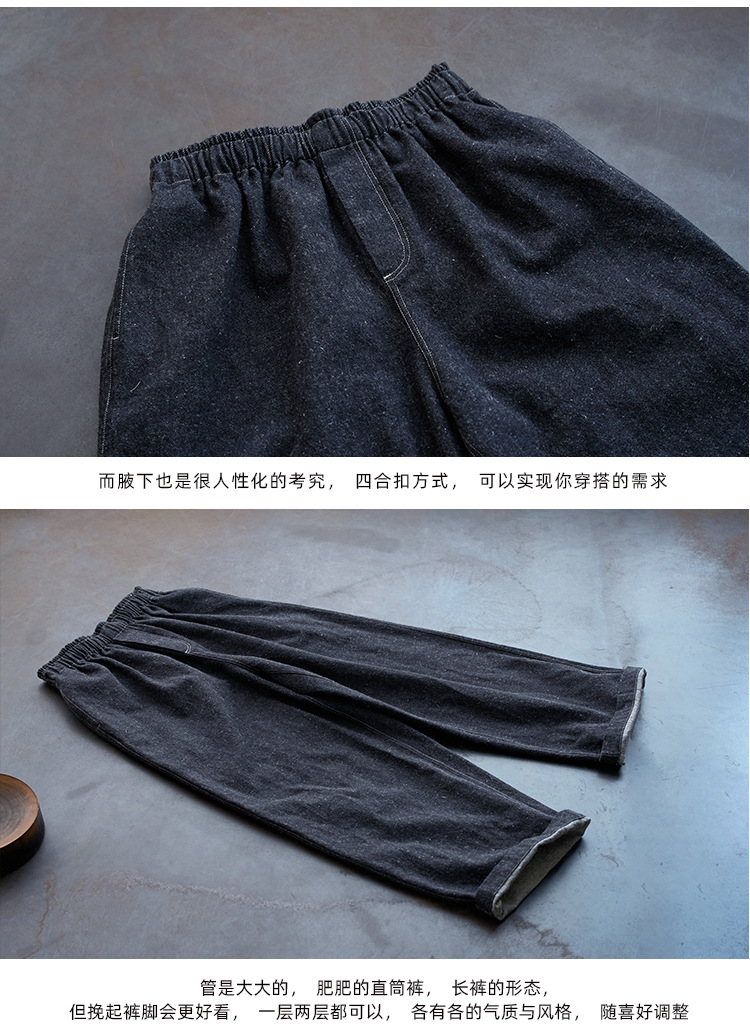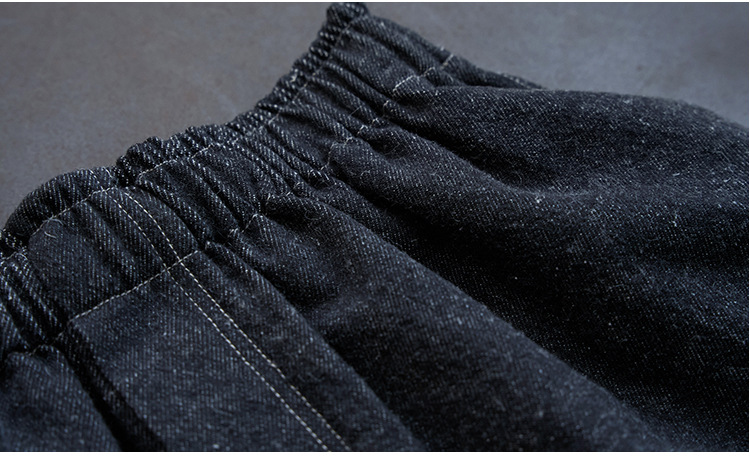Three-season black linen cotton elastic waist classic women's casual straight-leg jeans, retro loose, autumn and winter casual