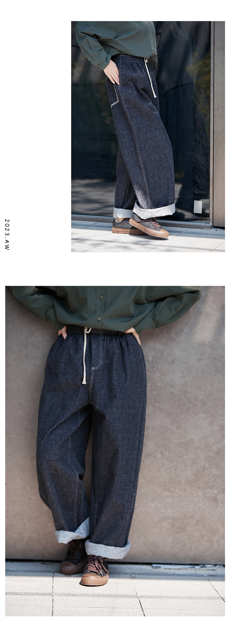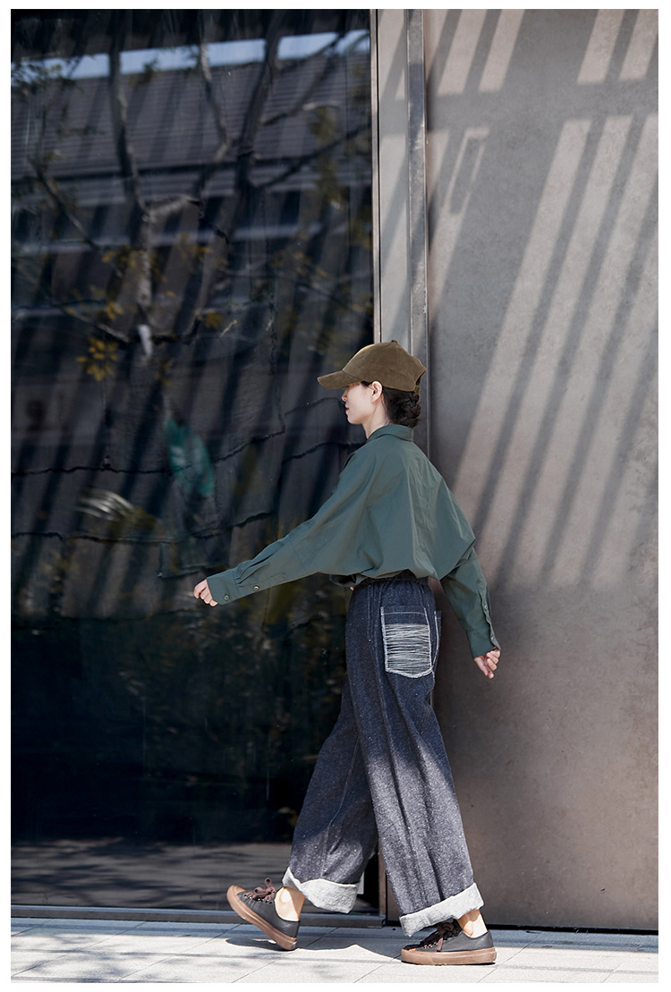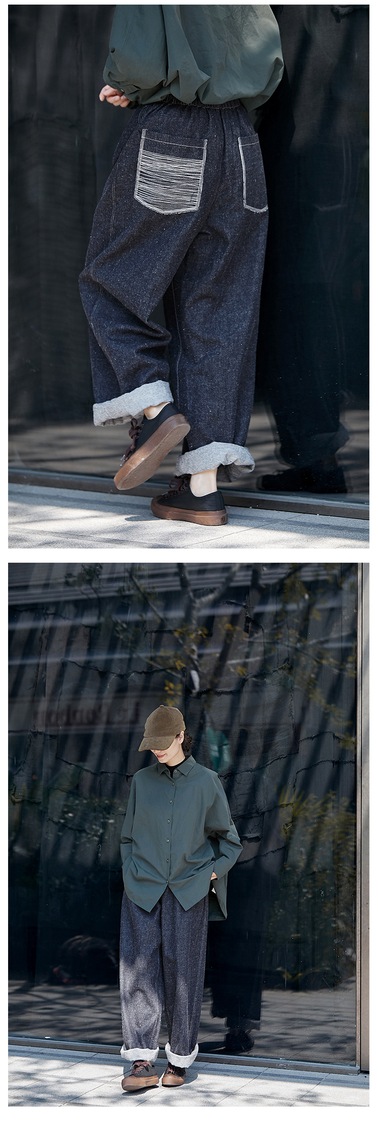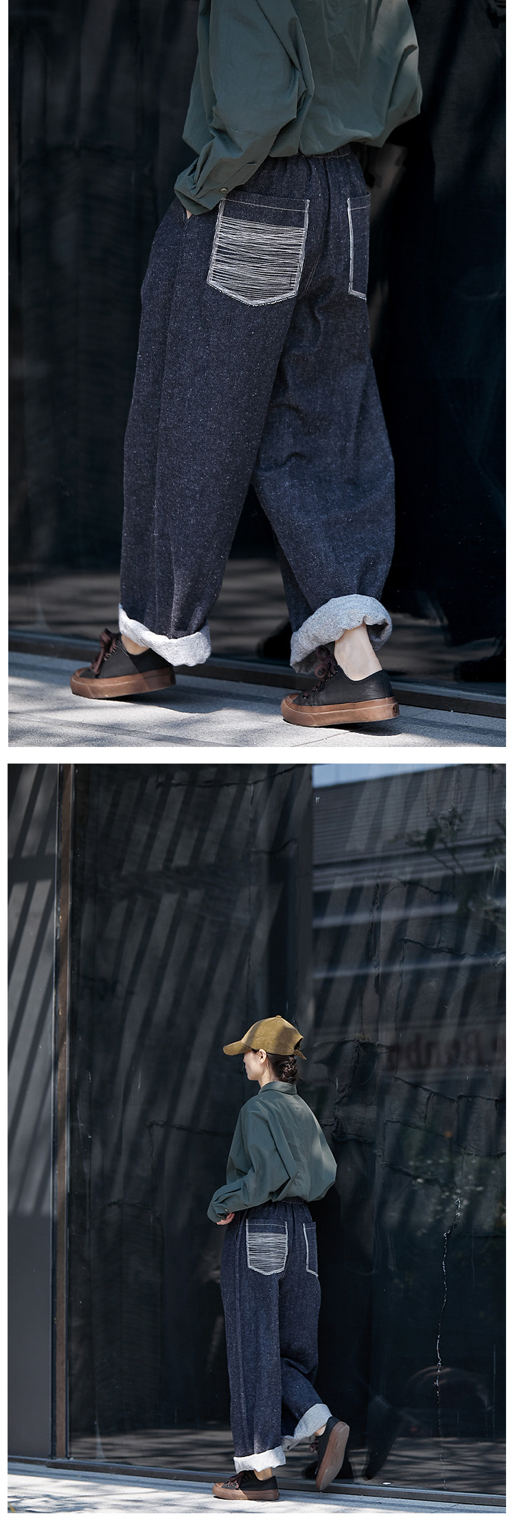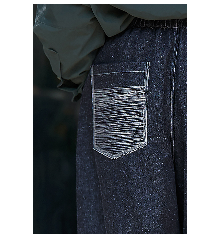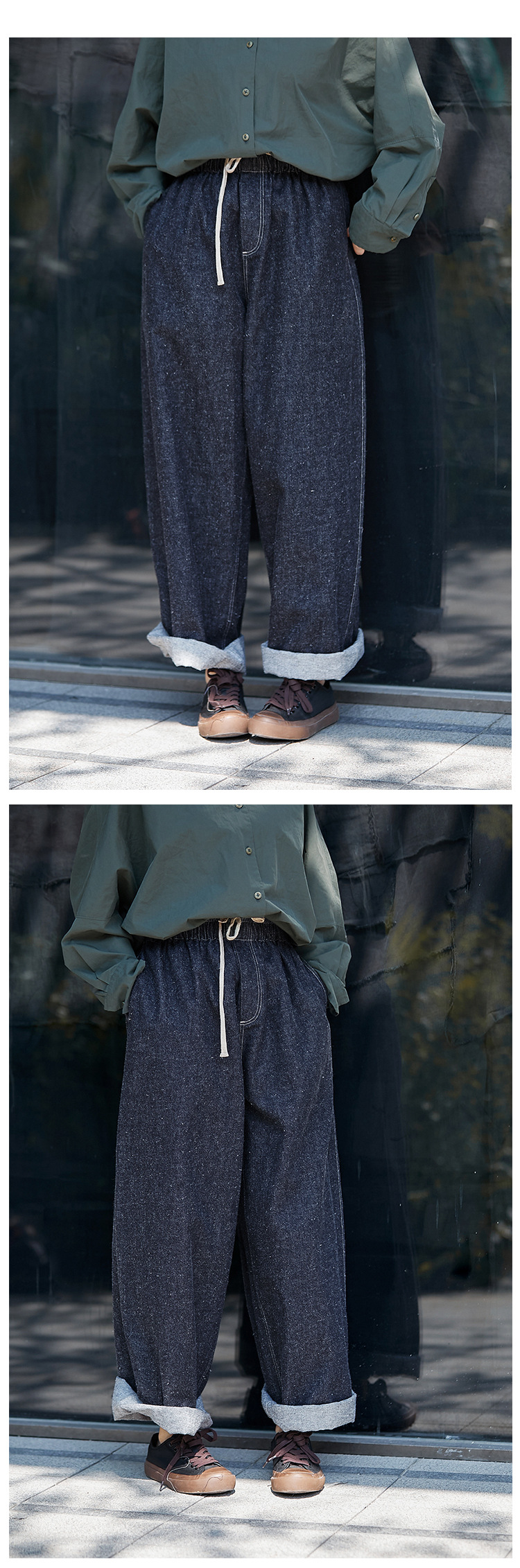 Three-season black linen cotton elastic waist classic women's casual straight-leg jeans, retro loose, autumn and winter casual